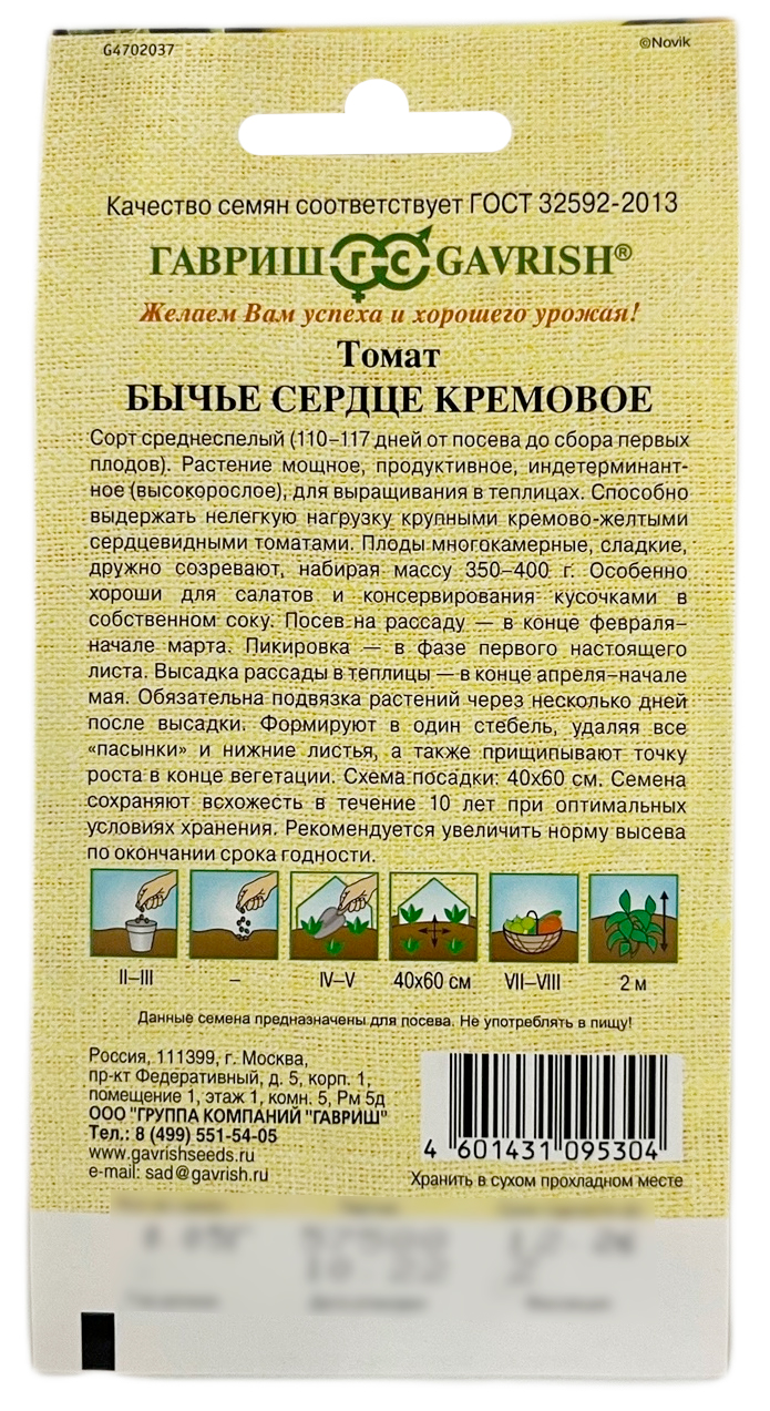 Томат БЫЧЬЕ СЕРДЦЕ КРЕМОВОЕ ГАВРИШСорт среднеранний (110-117 дней от посева до уборки). Растение мощное, продуктивное, индетерминантное (высокорослое) для выращивания в теплицах. Способно выдержать нелегкую нагрузку крупными кремово-желтыми сердцевидными томатами. Плоды многокамерные, сладкие, дружно созревают, набирая массу 350-400 г. Особенно хороши для салатов и консервирования кусочками в собственном соку. Посев на рассаду — в конце февраля-начале марта. Пикировка — в фазе первого настоящего листа. Высадка рассады в теплицы — в конце апреля-начале мая. Обязательна подвязка растений через несколько дней после высадки. Формируют в один стебель, удаляя все «пасынки» и нижние листья, а также прищипывают точку роста в конце вегетации.
