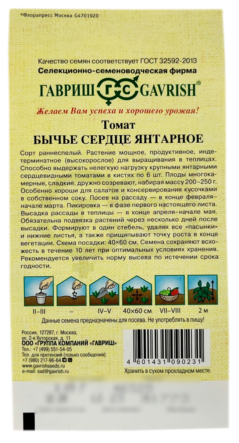 Томат БЫЧЬЕ СЕРДЦЕ ЯНТАРНОЕ ГАВРИШСорт среднеранний. Растение мощное, продуктивное, индетерминатное (высокорослое) для выращивания в теплицах. Способно выдержать нелегкую нагрузку крупными янтарными сердцевидными томатами в кистях по 6 шт. Плоды многокамерные, сладкие, дружно созревают, набирая массу 200-250 г. Особенно хороши для салатов и консервирования кусочками в собственном соку. Посев на рассаду - в конце февраля-начале марта. Пикировка - в фазе первого настоящего листа. Высадка рассады в теплицы - в конце апреля-начале мая. Обязательна подвязка растений через несколько дней после высадки. Формируют в один стебель, удаляя все «пасынки» и нижние листья, а также прищипывают точку роста в конце вегетации. Схема посадки: 40х60 см.