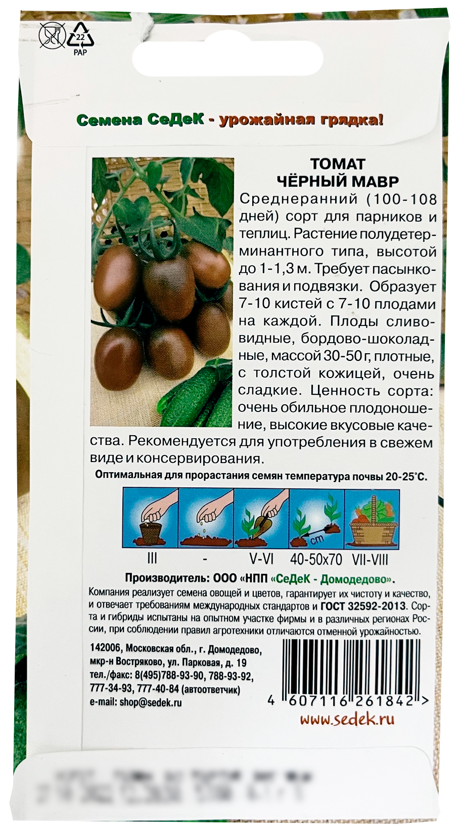 ТОМАТ ЧЁРНЫЙ МАВРСреднеранний (100-108 дней) сорт для парников и теплиц. Растение полудетерминантного типа, высотой до 1-1,3 м. Требует пасынкования и подвязки. Образует 7-10 кистей с 7-10 плодами на каждой. Плоды сливовидные, бордово-шоколадные, массой 30-50 г, плотные, с толстой кожицей, очень сладкие. Ценность сорта: очень обильное плодоношение, высокие вкусовые качества. Рекомендуется для употребления в свежем виде и консервирования.
