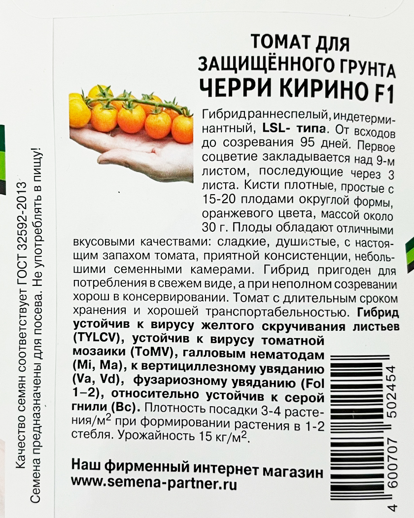 Томат Черри Кирино F1 5штГибрид раннеспелый, индетерминантный, LSL- типа. От всходов до созревания 95 дней. Первое соцветие закладывается над 9-м листом, последующие через 3 листа. Кисти плотные, простые с 15-20 плодами округлой формы, оранжевого цвета, массой около 30 г. Плоды обладают отличными вкусовыми качествами: сладкие, душистые, с настоящим запахом томата, приятной консистенции, небольшими семенными камерами. Гибрид пригоден для потребления в свежем виде, а при неполном созревании хорош в консервировании. Томат с длительным сроком хранения и хорошей транспортабельностью. Гибрид устойчив к вирусу желтого скручивания листьев (TYLCV), устойчив к вирусу томатной мозаики (ToMV), галловым нематодам (Mi, Ma), к вертициллезному увяданию (Va, Vd), фузариозному увяданию (Fol 1–2), относительно устойчив к серой гнили (Bc). Плотность посадки 3-4 растения/м2 при формировании растения в 1-2 стебля. Урожайность 15 кг/м2.