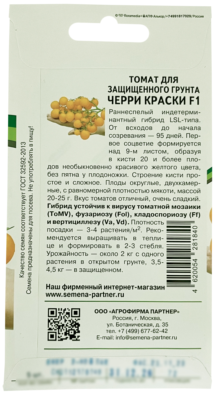 Томат Черри Краски F1Гибрид раннеспелый, индетерминантный, LSL- типа. От всходов до начала созревания 95 дней. Первое соцветие формирует над 9-м листом, образуя около 20 и более плодов в кисти, в зависимости от строения - простое или сложное. Плоды округлые, двухкамерные, в биологической спелости насыщенно желтого цвета, без пятна у плодоножки, отличного вкуса, массой 20-25 г, с равномерной плотностью мякоти. Гибрид устойчив к вирусу томатной мозаики, фузариозу, кладоспориозу и вертициллезу. Плотность посадки 3-4 растения/м2, при формировании в 1-2 стебля. Урожайность около 3 кг с одного растения.