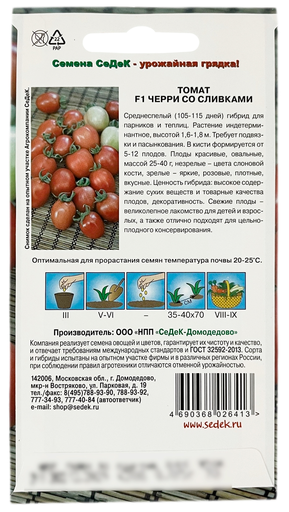 Томат F1 ЧЕРРИ СО СЛИВКАМИ СеДеКСреднеспелый (105-115 дней) сорт для парников и теплиц. Растение индетерминантное, высотой 1,6-1,8 м. Требует подвязки и пасынкования. В кисти формируется от 5-12 плодов. Плоды красивые, овальные, массой 25-40 г, незрелые - цвета слоновой кости, зрелые – яркие, розовые, плотные, вкусные. Ценность сорта: высокое содержание сухих веществ и товарные качества плодов, декоративность. Свежие плоды – великолепное лакомство для детей и взрослых, а так же отлично подходят для цельноплодного консервирования.