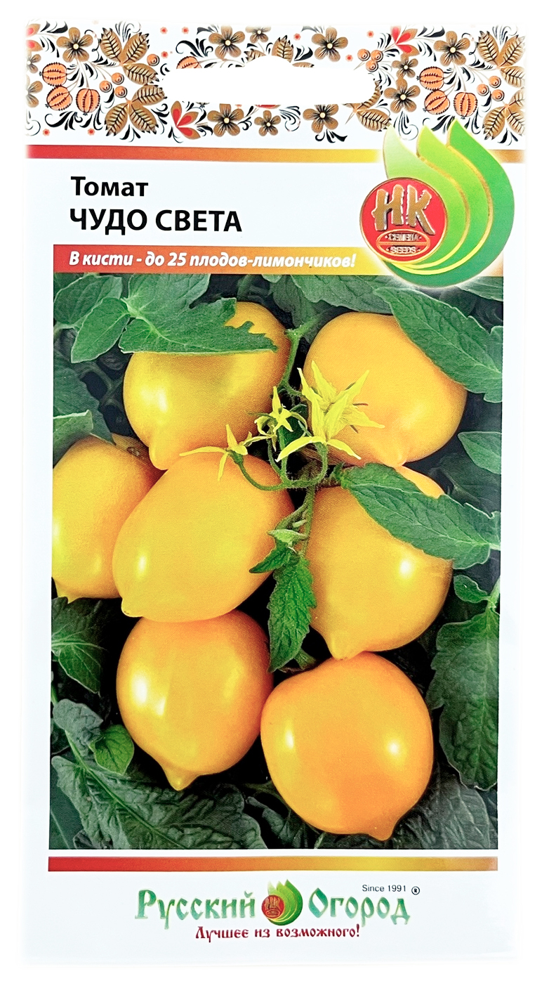 Томат ЧУДО СВЕТА Русский ОгородСреднепоздний сорт томатов, известный своими сладкими и красивыми плодами. Помидоры сорта «Чудо света» имеют ярко-жёлтый окрас, правильную продолговатую форму, с характерным заострённым носиком. Плоды у растения выровненные и плотные, небольшие – каждый помидор весит в пределах 60-90 г. Очень урожайный сорт, на одной кисти формируется 30-40 плодов. Благодаря высокому содержанию бета-каротина и сахара, помидоры «Чудо света» славятся своими полезными свойствами и сладким вкусом. Визуально эти помидоры – по цвету, форме и размерам – напоминают лимон.