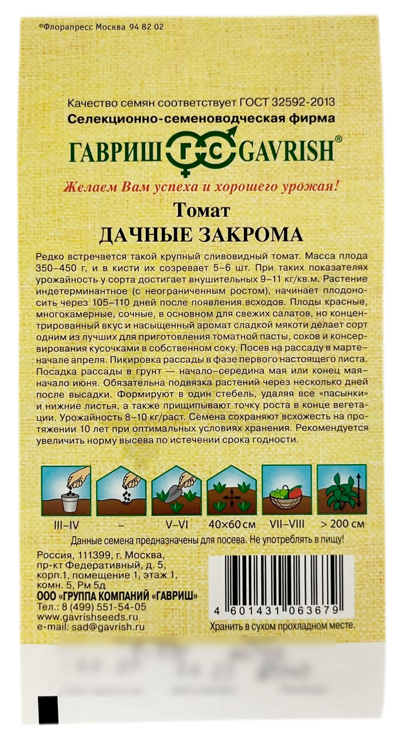 Томат ДАЧНЫЕ ЗАКРОМА ГАВРИШРедко встречается такой крупный сливовидный томат. Масса плода 350-450 г, и в кисти их созревает 5-6 шт. При таких показателях урожайность у сорта достигает внушительных 9-11 кг/м². Растение индетерминантное (с неограниченным ростом), начинает плодоносить через 105-110 дней после появления всходов. Плоды красные, многокамерные, сочные, в основном для свежих салатов, но концентрированный вкус и насыщенный аромат сладкой мякоти делает сорт одним из лучших для приготовления томатной пасты, соков и консервирования кусочками в собственном соку. Используется в свежем виде и для переработки. Посев на рассаду в марте — начале апреля. Пикировка рассады в фазе первого настоящего листа. Посадка рассады в грунт — начало-середина мая или конец мая–начало июня. Обязательна подвязка растений через несколько дней после высадки. Формируют в один стебель, удаляя все "пасынки" и нижние листья, а также прищипывают точку роста в конце вегетации. Урожайность 8-10 кг/раст.