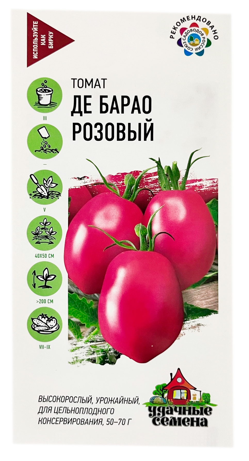 Томат ДЕ БАРАО РОЗОВЫЙ Удачные СеменаСреднеспелый (115-120 дней от всходов до плодоношения) высокорослый сорт для пленочных и остекленных теплиц или для выращивания в открытом грунте (в более южных регионах). Растение среднерослое, средневетвистое, высотой более 2 м. Требует подвязки и пасынкования. Первое соцветие закладывается над 9-11 листом, последующие - через 3 листа. Плод овальный, плотный, окраска незрелого плода зеленая, с темным пятном, зрелого — розовая. Масса плода 50-70 г. Вкус отличный. Товарная урожайность до 5,4-6,8 кг/кв.м. Слабо поражается фитофторозом. Ценится за высокую урожайность, хорошие вкусовые и технологические качества плодов. Рекомендован для употребления в свежем виде и цельноплодного консервирования.
