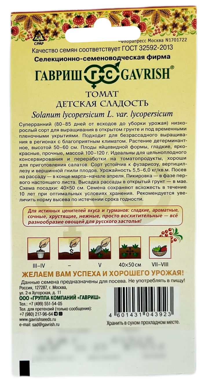 Томат Детская сладостьСуперранний (80-85 дней от всходов до уборки урожая) низкорослый сорт для выращивания в открытом грунте и под временными пленочными укрытиями. Подходит для безрассадного выращивания в регионах с благоприятным климатом. Растение детерминантное, высотой 50-60 см. Плоды яйцевидной формы, гладкие, ярко-красные, прочные, массой 100-120 г. Идеальны для цельноплодного консервирования и переработки на томатопродукты, хороши для приготовления салатов. Сорт устойчив к фузариозу, вертициллезу и вершинной гнили плодов. Урожайность 5,5-6,0 кг/м2. Посев на рассаду - в конце марта - начале апреля. Пикировка - в фазе первого настоящего листа. Высадка рассады в открытый грунт - в мае.