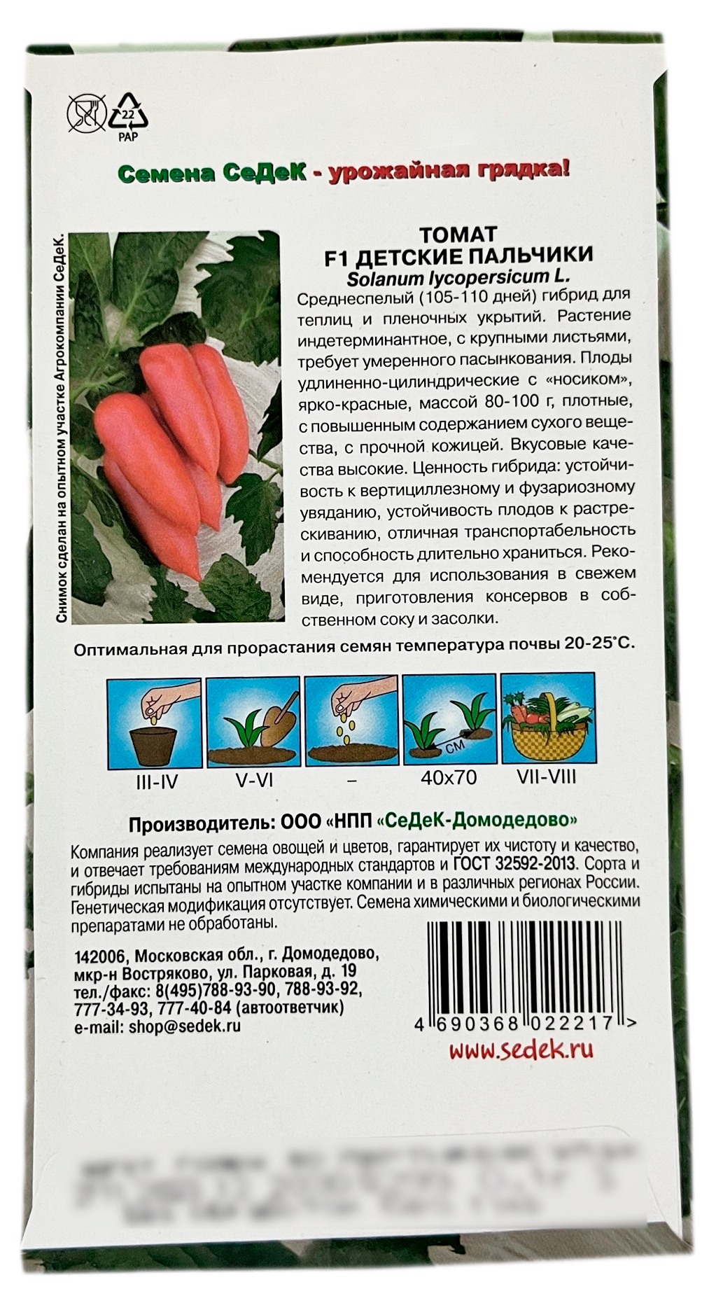 Томат F1 ДЕТСКИЕ ПАЛЬЧИКИ СеДеКСреднеспелый (105-110 дней) гибрид для теплиц и пленочных укрытий. Растение индетерминантное, с крупными листьями, требует умереного пасынкования. Плоды удлиненно-цилиндрические с «носиком», ярко-красные, массой 80-100 г, плотные, с повышенным содержанием сухого вещества, с прочной кожицей. Вкусовые качества высокие. Ценность гибрида: устойчивость к вертициллезному и фузариозному увяданию, устойчивость плодов к растрескиванию, отличная транспортабельность и способность длительно храниться. Рекомендуется для использования в свежем виде, приготовления консервов в собственном соку и засолки.