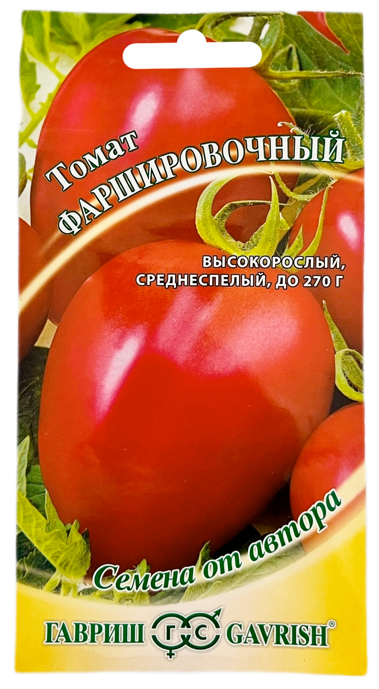 Томат ФАРШИРОВОЧНЫЙ ГАВРИШСреднеспелый (от всходов до созревания 110-115 дней) индетерминантный (с неограниченным ростом) сорт, рекомендован для пленочных и остекленных теплиц. Плоды красные крупные, овально-яйцевидной формы, мясистые, массой 150-200 (до 270) г. Используется в свежем виде, для переработки и фарширования. Посев на рассаду — в конце февраля-начале марта. Пикировка рассады в фазе первого настоящего листа. В период выращивания рассады необходима досветка. Высадка в теплицы — в конце апреля в возрасте 50-55 дней. Обязательна подвязка растений через несколько дней после посадки. Формируют в один стебель, удаляя все «пасынки» и нижние листья, а также прищипывают точку роста в конце вегетации.