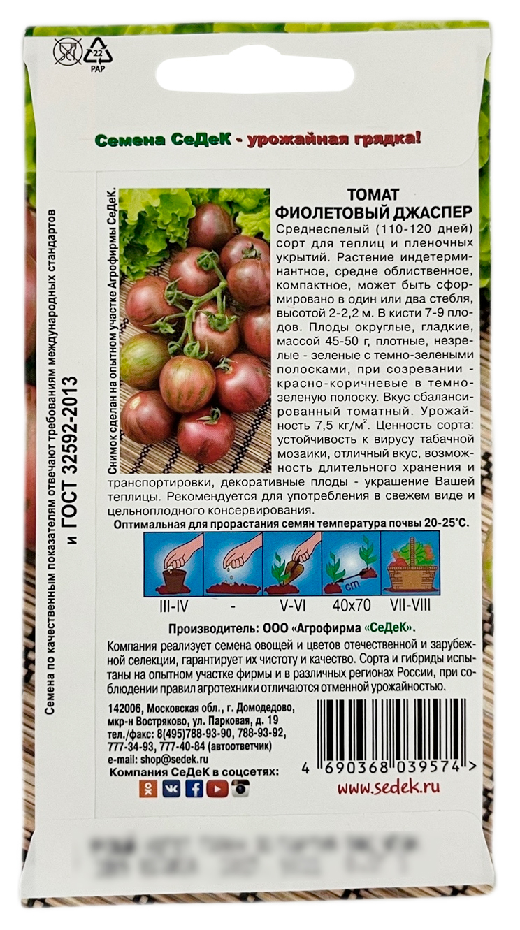 Томат ФИОЛЕТОВЫЙ ДЖАСПЕР СеДеКСреднеспелый (110-120 дней) сорт для теплиц и пленочных укрытий. Растение индетерминантное, средне облиственное, компактное, может быть сформировано в один или два стебля, высотой 2-2,2 м. В кисти 7-9 плодов. Плоды округлые, гладкие, массой 45-50 г, плотные, незрелые - зеленые с темно-зелеными полосками, при созревании - красно-коричневые в темно-зеленую полоску. Вкус сбалансированный томатный. Урожайность 7,5 кг/м2. Ценность сорта: устойчивость к вирусу табачной мозаики, отличный вкус, возможность длительного хранения и транспортировки, декоративные плоды - украшение Вашей теплицы. Рекомендуется для употребления в свежем виде и цельноплодного консервирования.