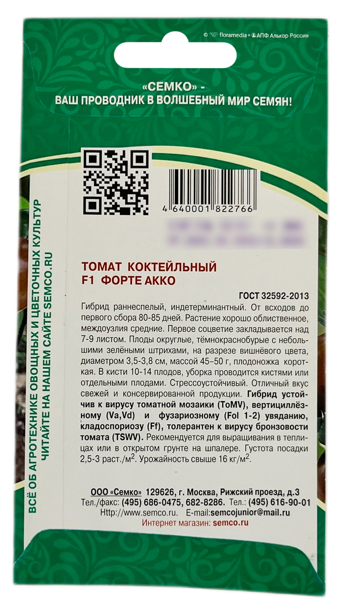 Томат ФОРТЕ АККО СЕМКОРанний, индетерминантный кистевой гибрид для выращивания в защищенном грунте или в открытом грунте с подвязкой к опоре. От всходов до созревания 80–85 дней. Растение хорошо облиственное, междоузлия средние, формируют в один стебель. Первое соцветие закладывается над 7–9 листом. Помидоры округлые, темной красно-бурой окраски с небольшими зелеными штрихами, на разрезе вишневого цвета, диаметром 3,5–3,8 см, массой 45–50 г, плодоножка короткая. В кисти формируется 10–14 плодов, уборка производится кистями или отдельными плодами. Стрессоустойчивый. Отличный вкус как свежей, так и консервированной продукции. Томат Форте Акко F1 устойчив к вирусу томатной мозаики (TоMV), вертициллезу (Va, Vd) и фузариозу (Fol 1–2), кладоспориозу (Ff), толерантен к бронзовости томата (TSWV). Рекомендуется для выращивания в теплицах или в открытом грунте с подвязкой к опоре. Схема посадки 70х40 см. Урожайность свыше 16 кг/м2.