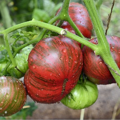 Среднеспелый сорт. Плоды тёмно-вишнёвые с серебристо-зелёными полосами, плоскоокруглые,массой около 300 гр. Мякоть пурпурная, мясистая, сочная, сладкая. Вкус сбалансированный, слегка пряный. Срок созревания 110-120 дней.Тип куста: детерминантный высота растения 80-120 см.
