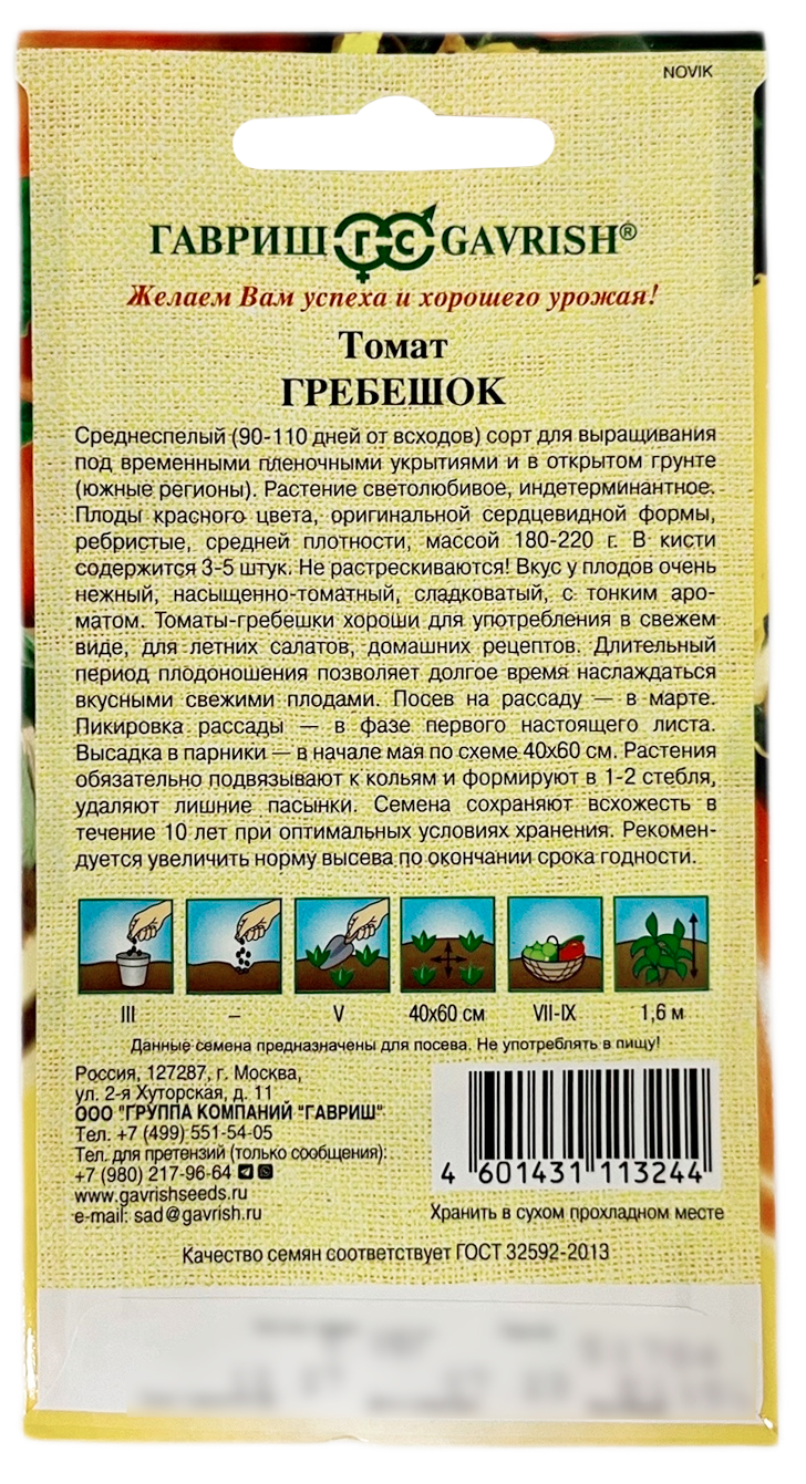 Томат ГРЕБЕШОК ГАВРИШСреднеспелый (90-110 дней от всходов) сорт для выращивания под временными пленочными укрытиями и открытом грунте (южные регионы). Растение светолюбивое, индетерминантное. Плоды красного цвета оригинальной сердцевидной формы, ребристые, средней плотности. Массой 180-220 г. В кисти содержится 3-5 штук. Не растрескиваются! Вкус у плодов очень нежный, насыщенно-томатный, сладковатый с тонким ароматом. Томаты-гребешки хороши для употребления в свежем виде, летних салатов, домашних рецептов. Длительный период плодоношения позволяет долгое время наслаждаться вкусными, свежими плодами. Посев на рассаду— в марте. Пикировка рассады — в фазе первого настоящего листа. Высадка в парники в начале мая, по схеме 40х60 см. Растения обязательно подвязывают к кольям и формируют в 1-2 стебля, удаляют лишние пасынки. Семена сохраняют всхожесть в течение 10 лет при оптимальных условиях хранения. Рекомендуется увеличить норму высева по окончанию срока годности.