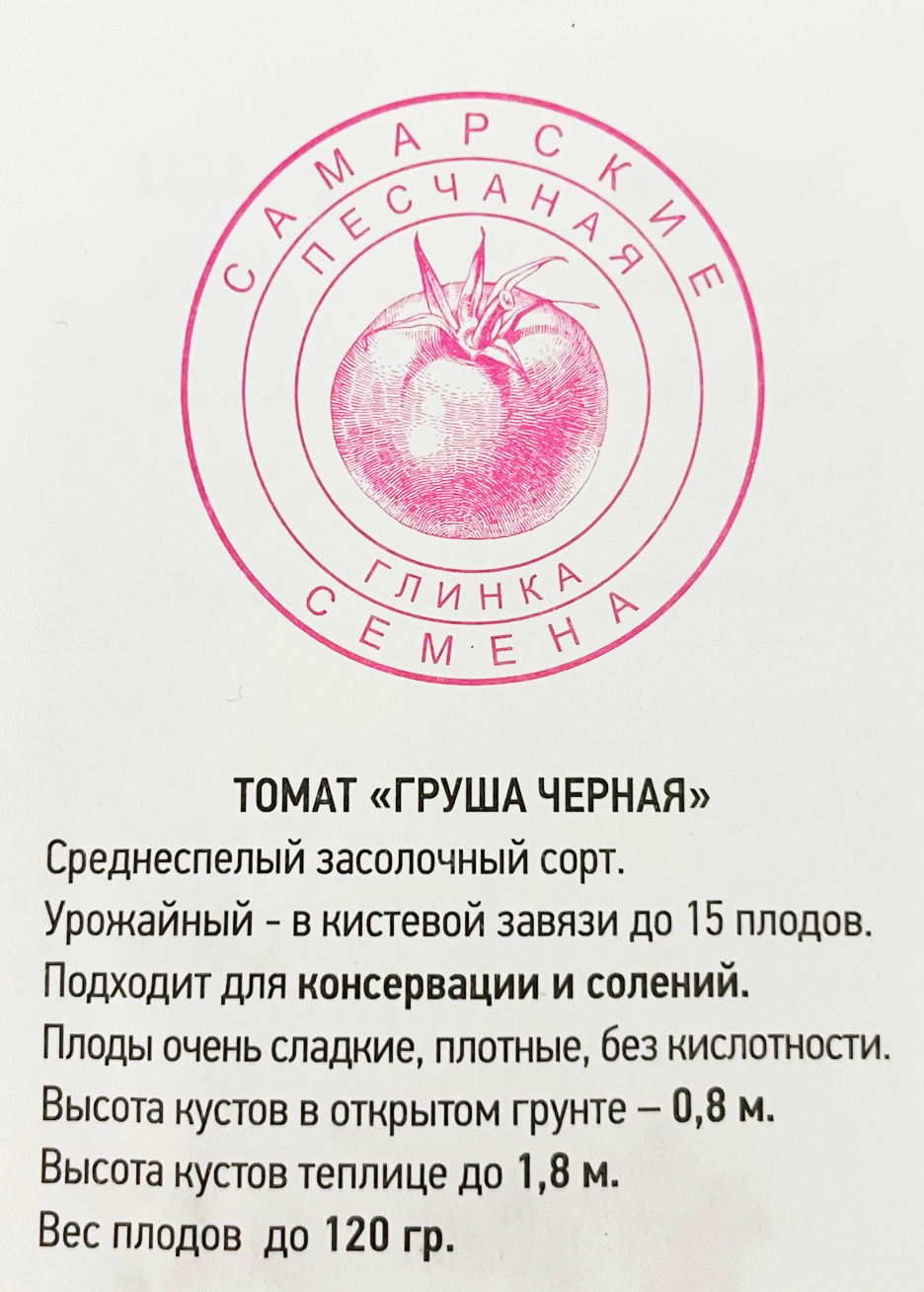 Томат Груша ЧёрнаяСреднеспелый засолочный сорт. Урожайный - в кистевой завязи до 15 плодов. Подходит для консервации и солений. Плоды очень сладкие, плотные, без кислотности. Высота кустов в открытом грунте - 0,8 м. Высота кустов теплице до 1,8 м. Вес плодов до 120 гр.
