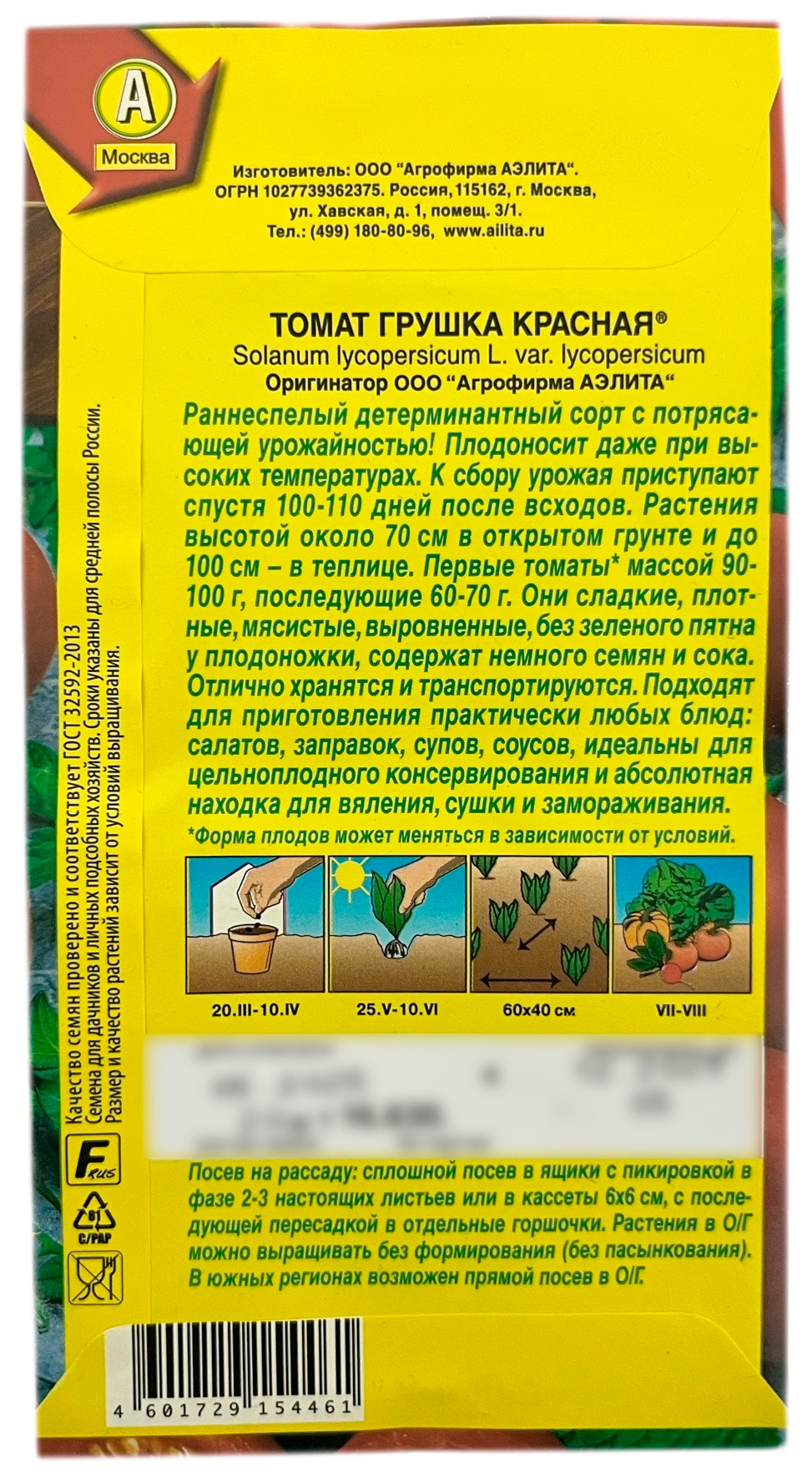 Томат ГРУШКА КРАСНАЯ АЭЛИТАРаннеспелый детерминантный сорт с потрясающей урожайностью! Плодоносит даже при высоких температурах. К сбору урожая приступают спустя 100-110 дней после всходов. Растения высотой около 70 см в открытом грунте и до 100 см – в теплице. Первые томаты* массой 90-100 г, последующие 60-70 г. Они сладкие, плотные, мясистые, выровненные, без зеленого пятна у плодоножки, содержат немного семян и сока. Отлично хранятся и транспортируются. Подходят для приготовления практически любых блюд: салатов, заправок, супов, соусов, идеальны для цельноплодного консервирования и абсолютная находка для вяления, сушки и замораживания. Форма плодов может меняться в зависимости от условий.