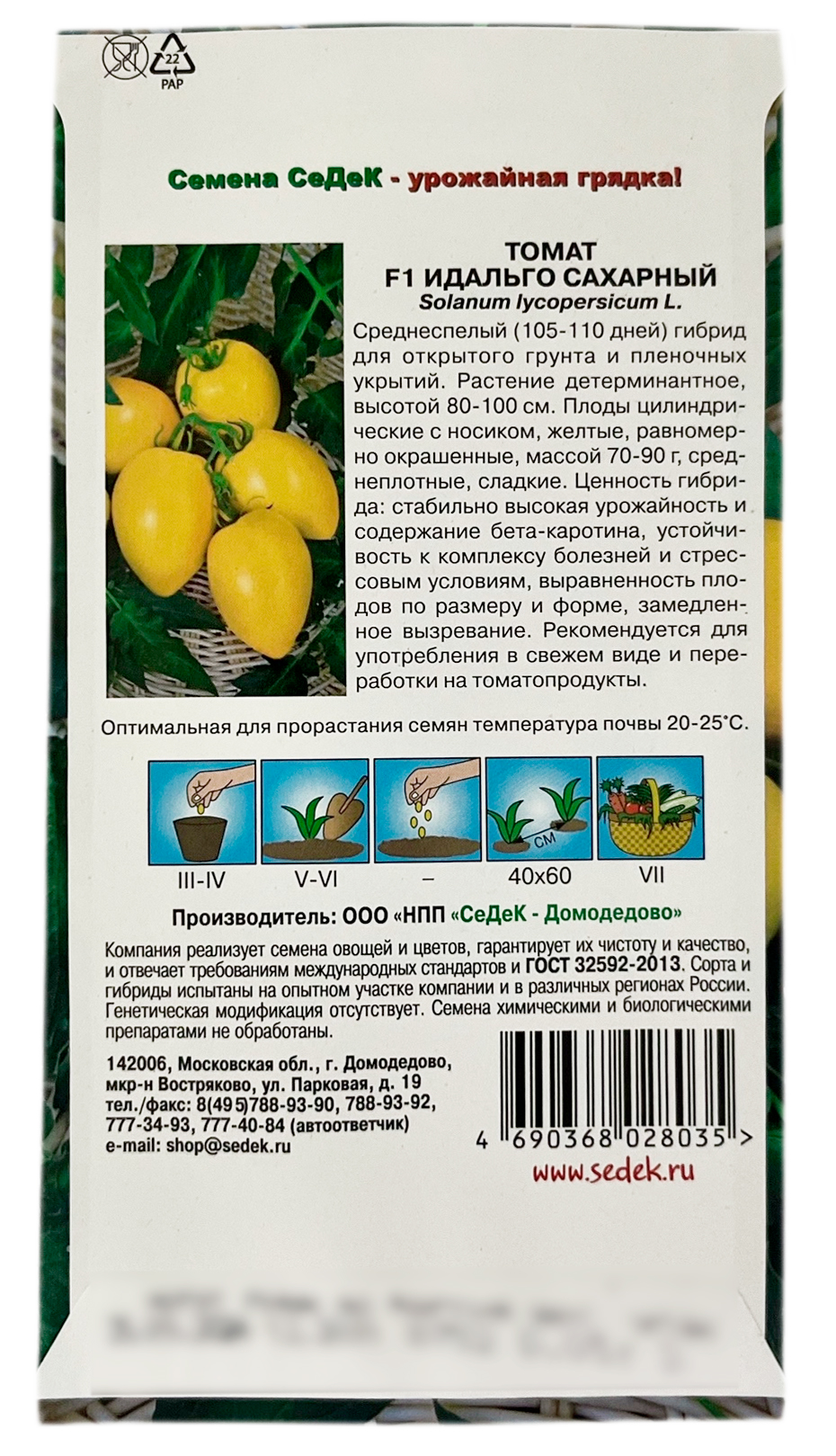 Томат F1 ИДАЛЬГО САХАРНЫЙ СеДеКСреднеспелый (105-110 дней) гибрид для открытого грунта и пленочных укрытий. Растение детерминантное, высотой 80-100см. Плоды цилиндрические с носиком, желтые, равномерно окрашенные, массой 70-90г, среднеплотные, сладкие. Ценность гибрида: стабильно высокая урожайность и содержание бета-каротина, устойчивость к комплексу болезней и стрессовым условиям, выравненность плодов по размеру и форме, замедленное вызревание. Рекомендуется для употребления в свежем виде и переработки на томатопродукты.