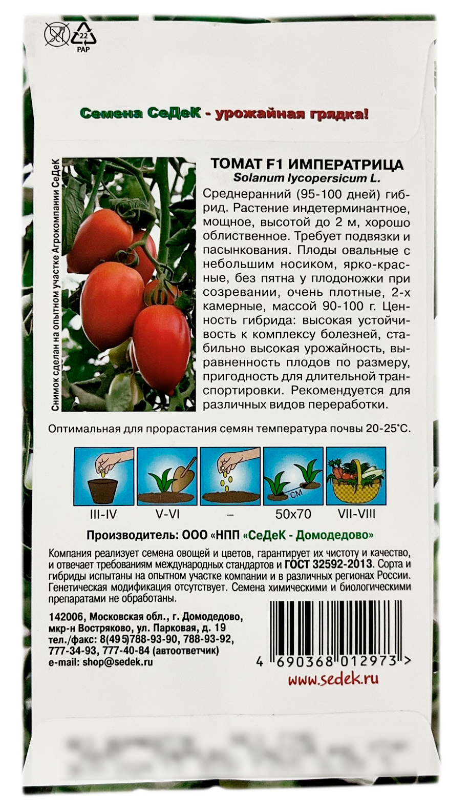 Томат F1 ИМПЕРАТРИЦА СеДеКСреднеранний (95-100 дней) гибрид. Растение индетерминантное, мощное, высотой до 2 м, хорошо облиственное. Требует подвязки и пасынкования. Плоды овальные с небольшим носиком, ярко-красные, без пятна у плодоножки при созревании, очень плотные, 2-х камерные, массой 90-100 г. Ценность гибрида: высокая устойчивость к комплексу болезней, стабильно высокая урожайность, выравненность плодов по размеру, пригодность для длительной транспортировки. Рекомендуется для различных видов переработки.
