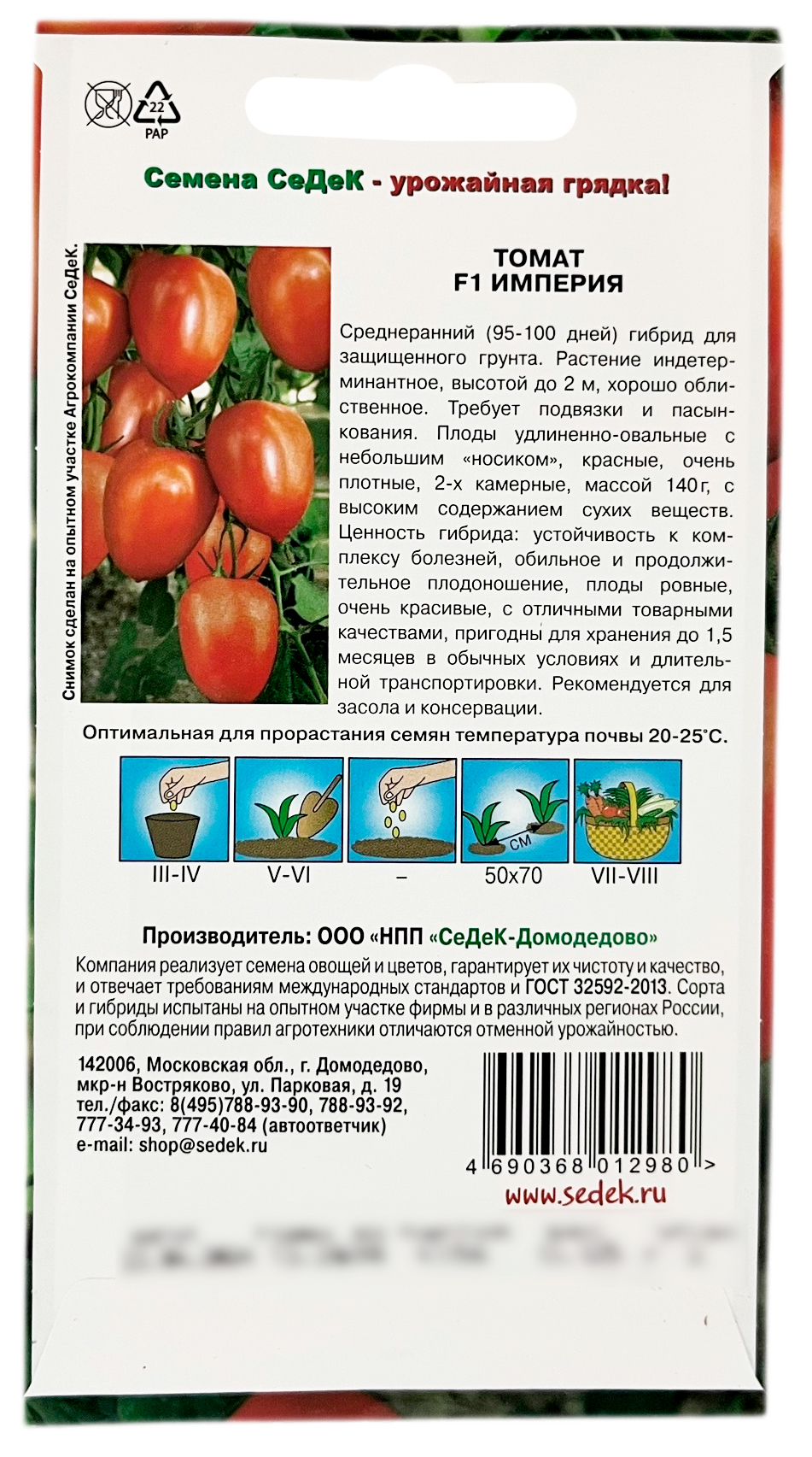 Томат F1 ИМПЕРИЯ СеДеКСреднеранний (95-100 дней) гибрид для защищенного грунта. Растение индетерминантное, высотой до 2 м, хорошо облиственное. Требует подвязки и пасынкования. Плоды удлиненно-овальные с небольшим «носиком», красные, очень плотные, 2-х камерные, массой 140 г, с высоким содержанием сухих веществ. Ценность гибрида: устойчивость к комплексу болезней, обильное и продолжительное плодоношение, плоды ровные, очень красивые, с отличными товарными качествами, пригодны для хранения до 1,5 месяцев в обычных условиях и длительной транспортировки. Рекомендуется для засола и консервации.