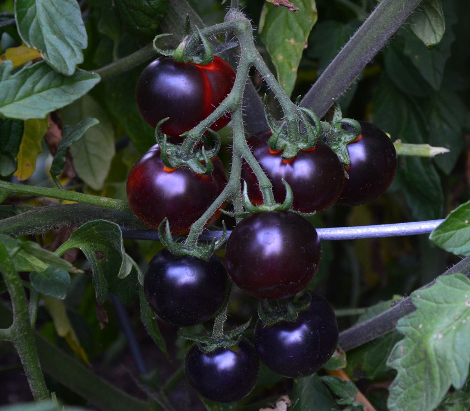 Томат черри, вес плода 15г. Индетерминантный, очень нарядный куст, когда созревают плоды. Тёмно-фиолетовый цвет у плодоножки, далее коричнево-малиновый. Формировать в 2-3 стебля.Характеристики