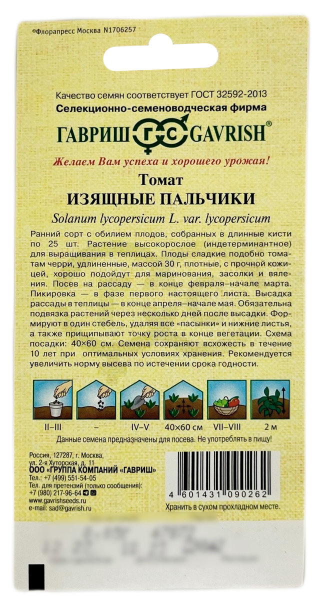 Томат ИЗЯЩНЫЕ ПАЛЬЧИКИРанний сорт с обилием плодов, собранных в длинные кисти по 25 шт. Растение высокорослое (индетерминантное) для выращивания в теплицах. Плоды сладкие подобно томатам черри, удлиненные, массой 30 г, плотные, с прочной кожицей, хорошо подойдут для маринования и засолки. Посев на рассаду - в конце февраля-начале марта. Пикировка - в фазе первого настоящего листа. Высадка рассады в теплицы - в конце апреля-начале мая. Обязательна подвязка растений через несколько дней после высадки. Формируют в один стебель, удаляя все «пасынки» и нижние листья, а также прищипывают точку роста в конце вегетации. Схема посадки: 40х60 см.