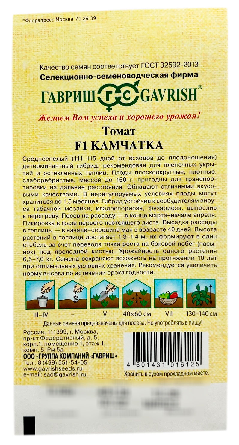 Томат Камчатка F1 ГАВРИШСреднеспелый (111-115 дней от всходов до плодоношения) детерминантный гибрид, рекомендован для пленочных укрытий и остекленных теплиц. Посев на рассаду в конце марта – начале апреля. Пикировка в фазе первого настоящего листа. Высадка рассады в теплицы в начале-середине мая в возрасте 40 дней. Высота растений в теплице достигает 1,3-1,4 м, их формируют в один стебель за счет перевода точки роста на боковой побег («пасынок») под последней кистью. Плоды плоскоокруглые, плотные, слаборебристые, массой до 150 г, пригодны для транспортировки на дальние расстояния. Обладают отличными вкусовыми качествами. В нерегулируемых условиях плоды могут храниться до 1,5 месяцев. Схема посадки 40х60 см. Гибрид устойчив к возбудителям вируса табачной мозаики, кладоспориоза, фузариоза, вынослив к перегреву. Урожайность одного растения 6,5-7,0 кг.