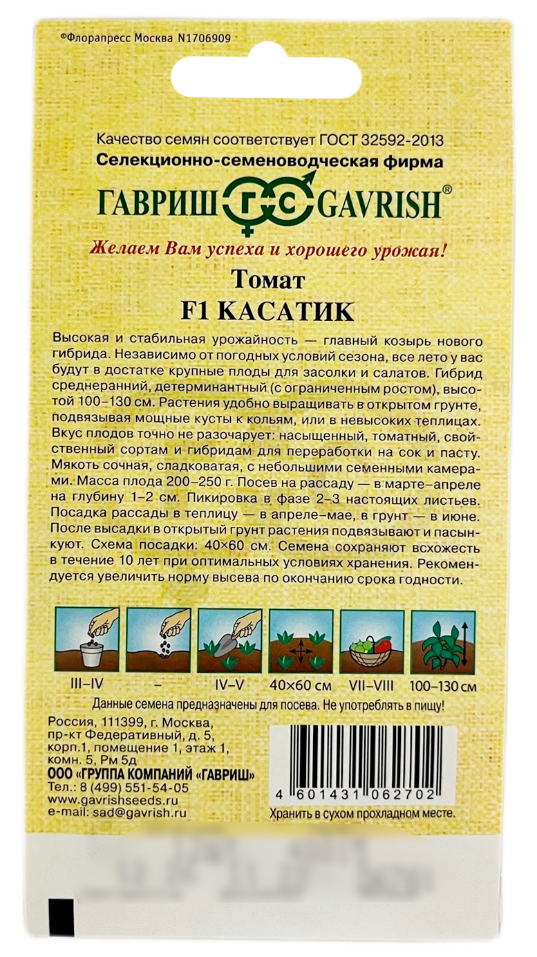 Томат Касатик ГАВРИШВысокая и стабильная урожайность — главный козырь нового гибрида. Независимо от погодных условий сезона, все лето у вас будут в достатке крупные плоды для засолки и салатов. Гибрид среднеранний, детерминантный (с ограниченным ростом), высотой 100-130 см. Растения удобно выращивать в открытом грунте, подвязывая мощные кусты к кольям, или в невысоких теплицах. Вкус плодов точно не разочарует: насыщенный, томатный, свойственный сортам и гибридам для переработки на сок и пасту. Мякоть сочная, сладковатая, с небольшими семенными камерами. Масса плода 200-250 г. Посев на рассаду в марте-апреле на глубину 1-2 см. Пикировка в фазе 2-3 настоящих листьев. Посадка рассады в теплицу в апреле-мае, в грунт - в июне. После высадки в открытый грунт растения подвязывают и пасынкуют. Схема посадки: 40x60 см.