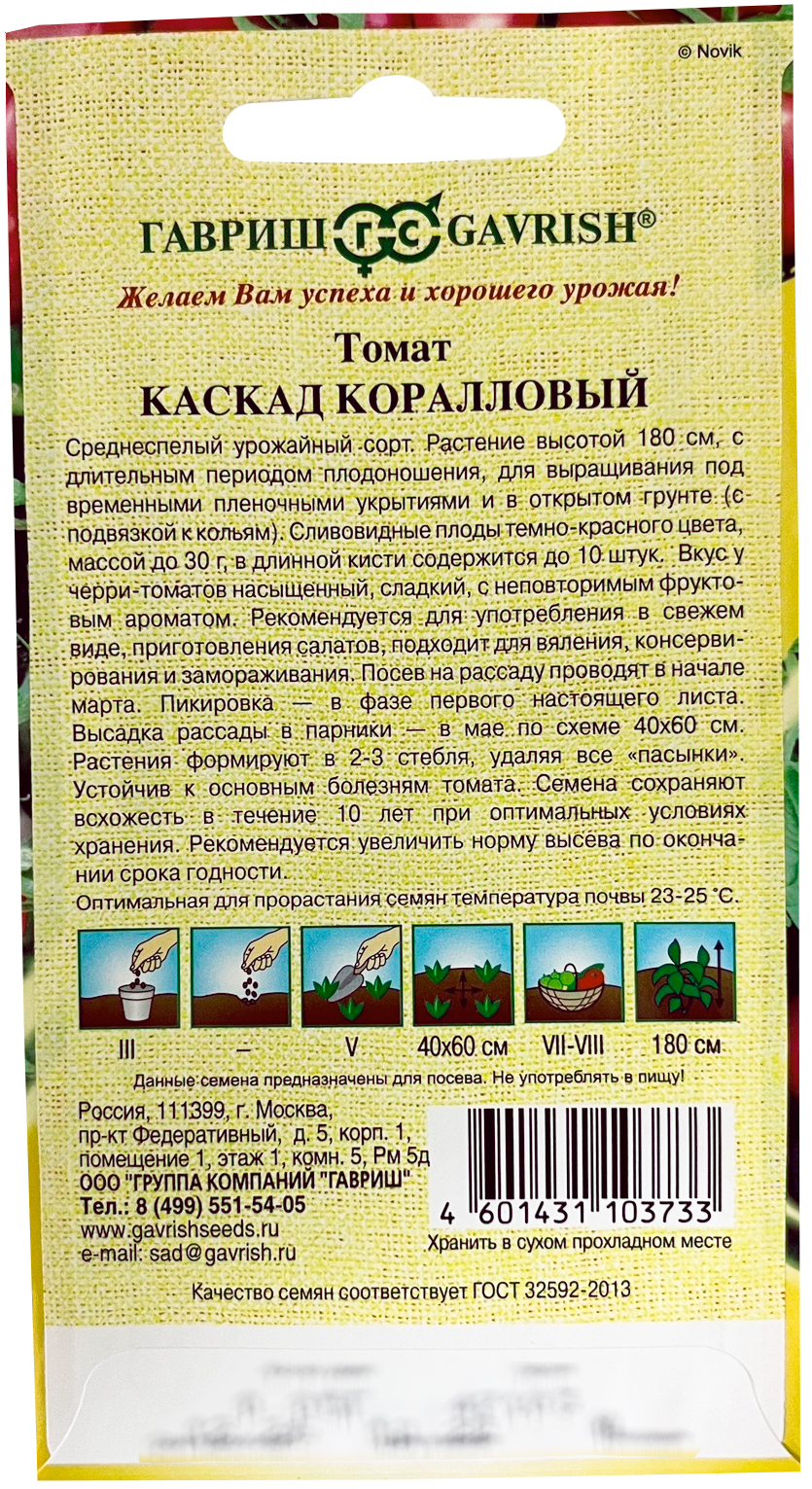 Томат Каскад коралловый ГАВРИШСреднеспелый урожайный сорт. Растение высотой 180 см с длительным периодом плодоношения для выращивания под временными пленочными укрытиями и в открытом грунте (с подвязкой к кольям). Сливовидные плоды темно-красного цвета массой до 30 г, в длинной кисти содержится до 10 шт. Вкус у черри-томатов насыщенный, сладкий с неповторимым фруктовым ароматом. Рекомендуется для употребления в свежем виде, приготовления салатов, подходит для вяления, консервирования и замораживания. Посев на рассаду проводят в начале марта. Пикировка — в фазе первого настоящего листа. Высадку рассады в парники — в мае по схеме 40х60 см. растения формируют в 2-3 стебля, удаляя все «пасынки». Устойчив к основным болезням томата. Семена после уборки сохраняют всхожесть в течение 10 лет при оптимальных условиях хранения. Рекомендуется увеличить норму высева по окончании срока годности.