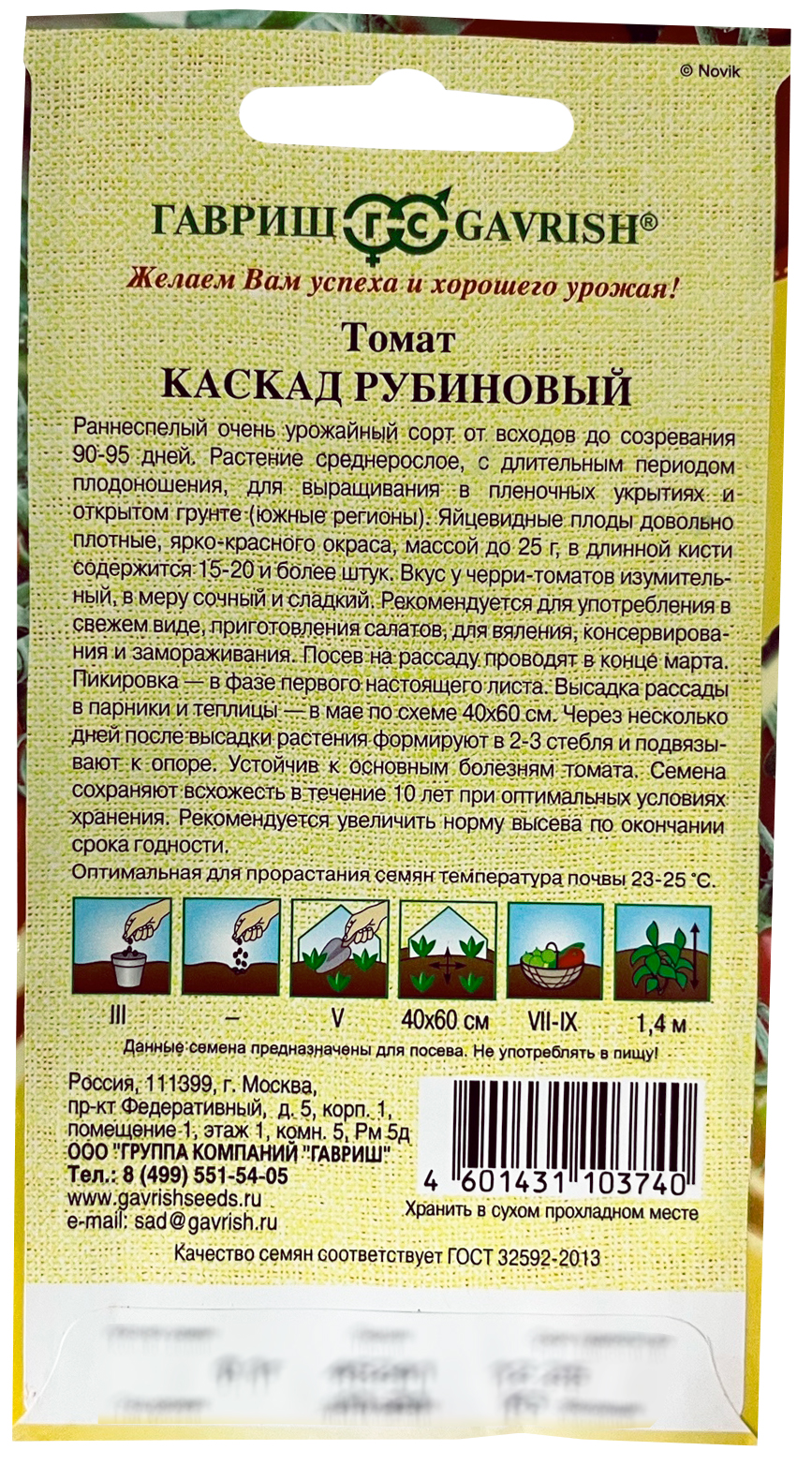 Томат Каскад рубиновый ГАВРИШСреднеспелый очень урожайный сорт. Растение среднерослое с длительным периодом плодоношения для выращивания под временными пленочными укрытиями и в открытом грунте (с подвязкой к кольям). Округлые плоды красного цвета, массой до 20 г, в разветвленной кисти содержится от 20 и более штук. Плоды необычайно вкусные, сладкие, ароматные. Рекомендуются для употребления в свежем виде, приготовления салатов, идеальны для маринования и замораживания. Посев на рассаду проводят в начале марта. Пикировка — в фазе первого настоящего листа. Высадку рассады в парники — в мае по схеме 40х60 см. Растения формируют в 2-3 стебля, удаляя все «пасынки». Устойчив к основным болезням томата. Семена после уборки сохраняют всхожесть в течение 10 лет при оптимальных условиях хранения.