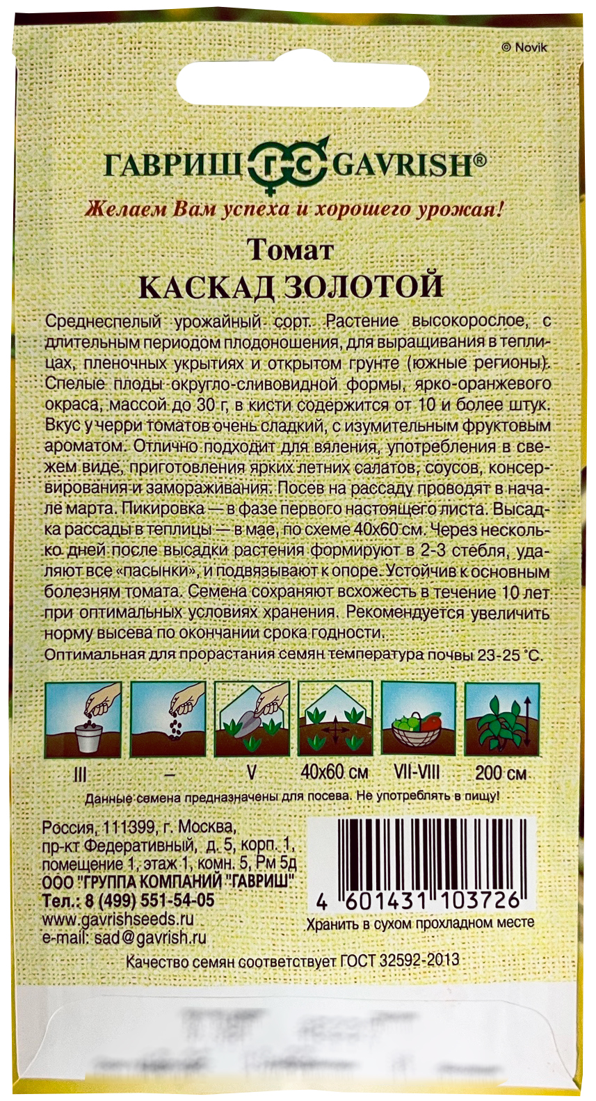Томат Каскад золотой ГАВРИШСреднеспелый урожайный сорт Растение высокорослое с длительным периодом плодоношения для выращивания в теплицах и пленочных укрытиях и открытом грунте (южные регионы). Спелые плоды округло-сливовидной формы, ярко-оранжевого окраса массой до 30 г, в кисти содержится от 10 и более штук. Вкус у черри-томатов очень сладкий с изумительным фруктовым ароматом. Отлично подходит для вяления, употребления в свежем виде, приготовления ярких, летних салатов, соусов, консервирования и замораживания. Посев на рассаду проводят в начале марта. Пикировка — в фазе первого настоящего листа. Высадку рассады в теплицы — в мае по схеме 40х60 см. Через несколько дней после высадки растения формируют в 2-3 стебля, удаляют все «пасынки» и подвязывают к опоре. Устойчив к основным болезням томата. Семена после уборки сохраняют всхожесть в течение 10 лет при оптимальных условиях хранения. Рекомендуется увеличить норму высева по окончании срока годности.