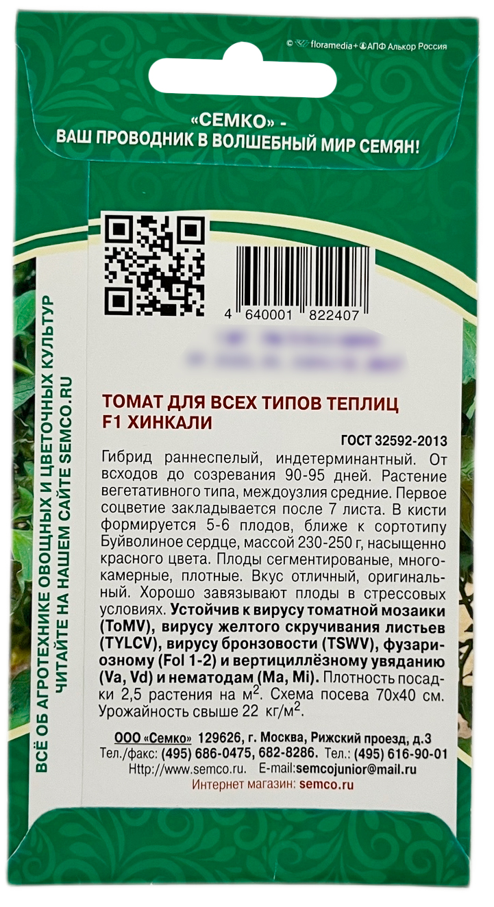 Томат ХИНКАЛИ СЕМКОранний индетерминантный гибрид. От всходов до созревания 90-95 дней. Растение вегетативного типа, междоузлия средние. Первое соцветие закладывается после 7 листа. В кисти формируется 5-6 плодов, ближе к сортотипу Буйволиное Сердце, массой 230-250 г, насыщенно-красного цвета. Плоды сегментированные, многокамерные, плотные. Вкус отличный, оригинальный. Хорошо завязывают плоды в стрессовых условиях. Устойчив к вирусу томатной мозаики (ToMV), вирусу желтого скручивания листьев (TYLCV), вирусу бронзовости (TSWV), фузариозному (Fol 1-2) и вертициллёзному увяданию (Va, Vd) и нематодам (Ma, Mi). Плотность посадки 2,5 растения на м2. Схема посева 70х40 см. Урожайность свыше 22 кг/м2.