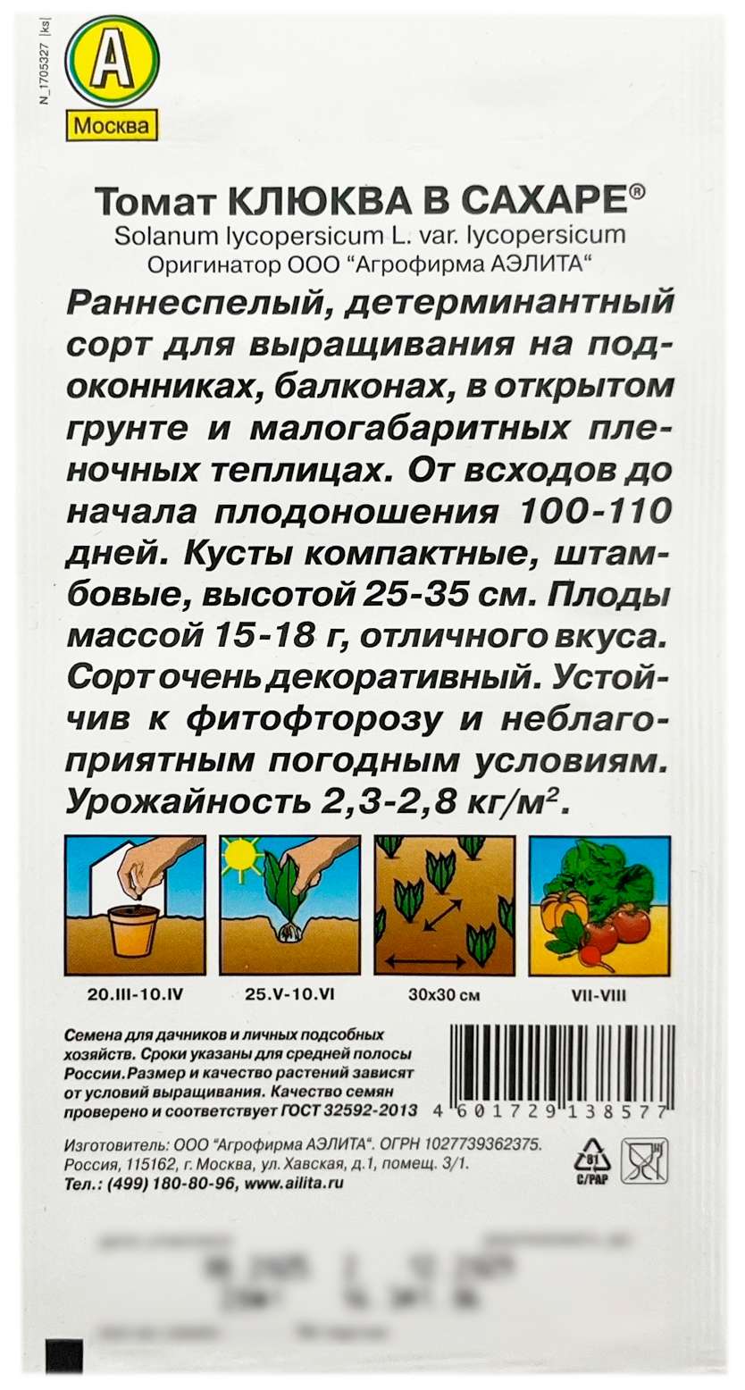 Томат КЛЮКВА В САХАРЕ АЭЛИТАРаннеспелый, детерминантный сорт для выращивания на подоконниках, в открытом грунте и малогабаритных пленочных теплицах. От всходов до начала плодоношения 100-110 дней. Кусты компактные, штамбовые, высотой 25-35 см. Плоды массой 15-18 г, отличного вкуса. Сорт очень декоративный. Устойчив к фитофторозу и неблагоприятным погодным условиям.