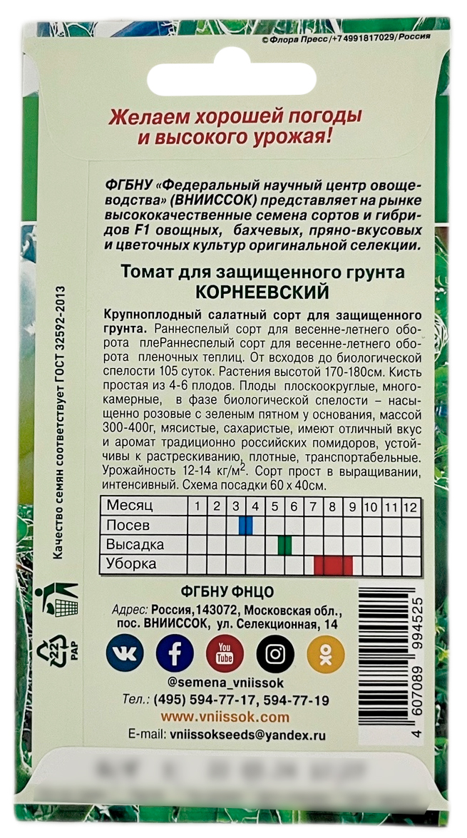 Томат КОРНЕЕВСКИЙ ВНИИССОКСорт раннеспелый, от всходов до биологической спелости 105 суток.