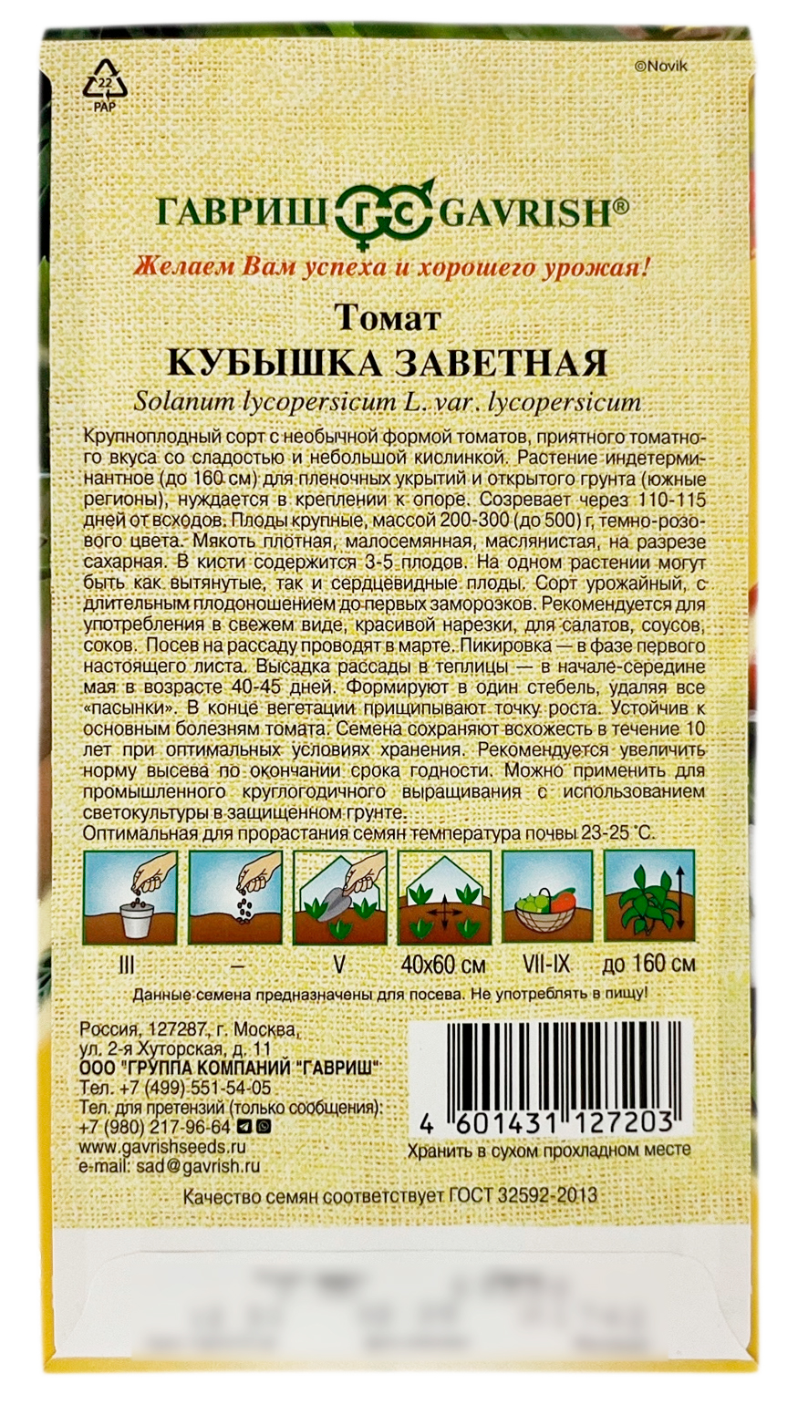 Томат КУБЫШКА ЗАВЕТНАЯ ГАВРИШКрупноплодный сорт с необычной кубовидной формой томатов, прекрасного томатного вкуса со сладостью и небольшой кислинкой. Растение индетерминантное (до 160 см) для пленочных укрытий и открытого грунта (южные регионы) в креплении к опоре. Созревает через 110-115 дней от всходов. Плоды крупные массой 250-300 (до 500 гр.) темно-розового цвета. Мякоть плотная, малосемянная, маслянистая, на разрезе сахарная. В кисти содержится 3-5 плодов. На одном растении могут быть как вытянутые, так и сердцевидные плоды. Рекомендуется для употребления в свежем виде, в салатах. Посев на рассаду проводят в марте. Пикировка — в фазе первого настоящего листа. Высадка рассады в теплицы — в начале-середине мая в возрасте 40-45 дней. Формируют в один стебель, удаляя все «пасынки». В конце вегетации прищипывают точку роста. Устойчив к основным болезням томата. Семена сохраняют всхожесть в течение 10 лет при оптимальных условиях хранения. Рекомендуется увеличить норму высева по окончании срока годности. Можно применить для промышленного круглогодичного выращивания с использованием светокультуры в защищенном грунте.