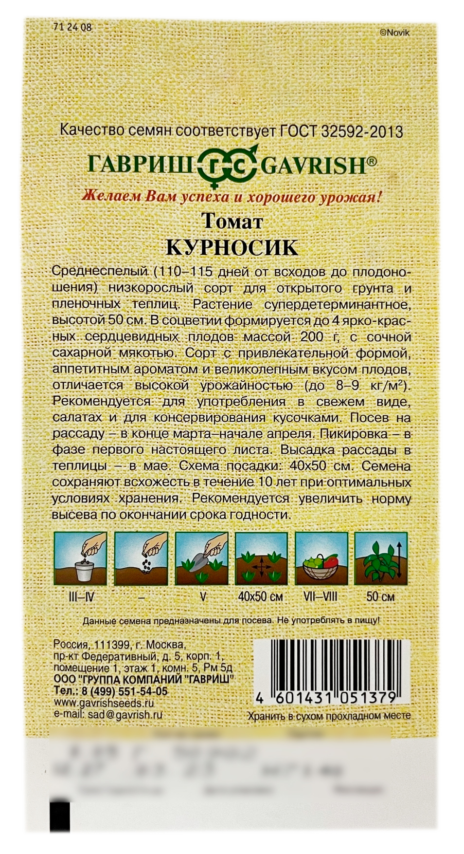 Томат КУРНОСИК ГАВРИШСреднеспелый (110-115 дней от всходов до плодоношения) низкорослый сорт для открытого грунта и пленочных теплиц. Растение супердетерминантное, высотой 50 см. В соцветии формируется до 4 ярко-красных сердцевидных плода массой 200 г с сочной сахарной мякотью. Сорт с привлекательной формой, аппетитным ароматом и великолепным вкусом плодов, отличается высокой урожайностью (до 8-9 кг/кв.м). Рекомендуется для употребления в свежем виде, в салатах и для консервирования кусочками. Посев на рассаду - в конце марта - начале апреля. Пикировка - в фазе первого настоящего листа. Высадка рассады в теплицы - в мае. Схема посадки: 40х50 см.