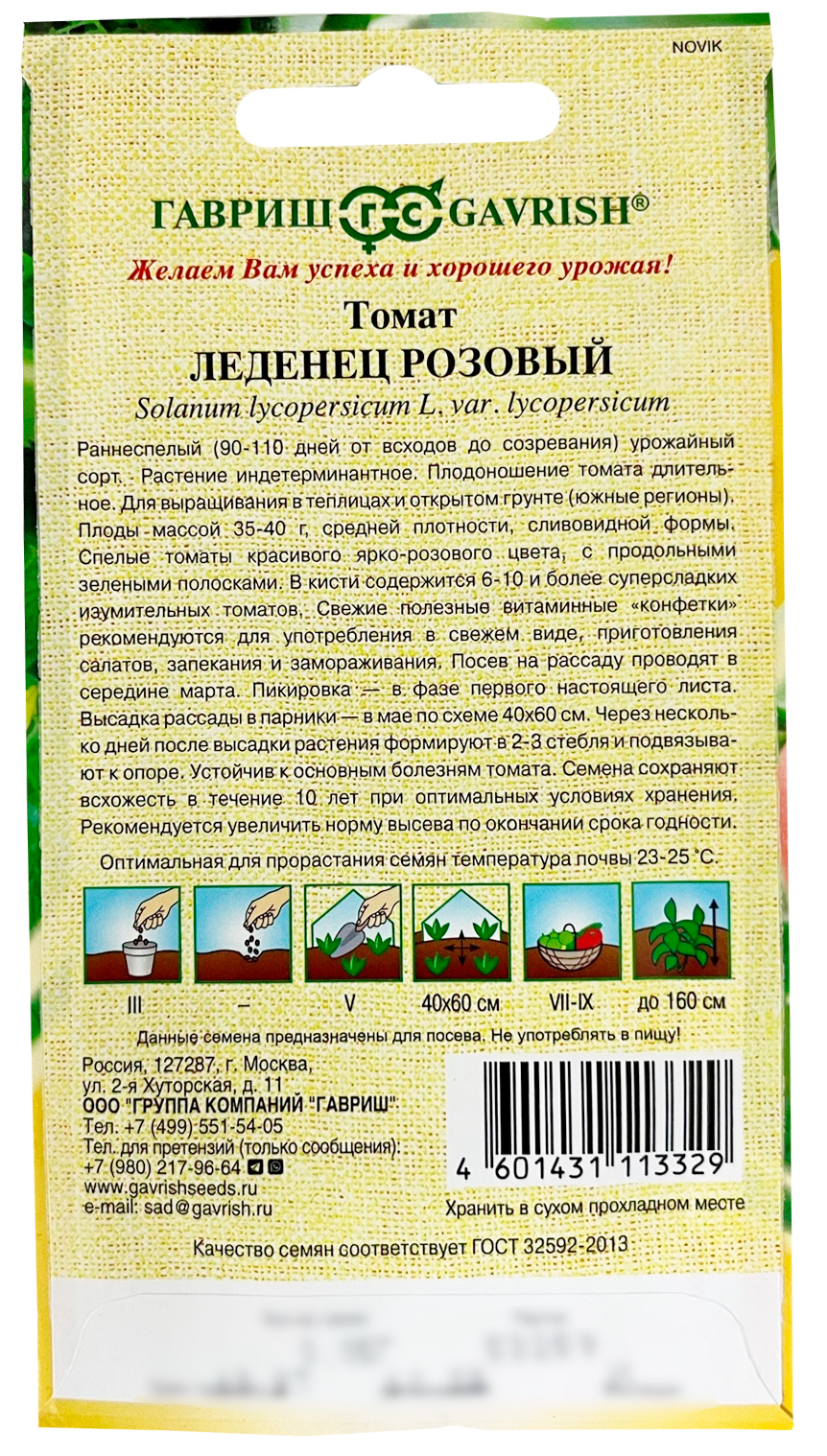 Томат Леденец розовыйСреднеранний урожайный (90-110 дней от всходов до созревания) сорт. Растение индетерминантное. Плодоношение томата длительное. Для выращивания в теплицах и открытом грунте (южные регионы). Плоды массой 35-40 г, средней плотности, сливовидной формы. Спелые томаты красивого ярко-розового цвета с продольными зелеными полосками. В кисти томата содержится 6-10 и более супер-сладких, изумительных томатов. Свежие, полезные витаминные «конфетки» рекомендуются для употребления в свежем виде, приготовления салатов, запекания, вяления и замораживания. Посев на рассаду проводят в начале марта. Пикировка — в фазе первого настоящего листа. Высадку рассады в теплицы — в мае по схеме 40х60 см. Через несколько дней после высадки растения формируют в один стебель удаляя все «пасынки». Семена сохраняют всхожесть в течение 10 лет при оптимальных условиях хранения. Рекомендуется увеличить норму высева по окончании срока годности.