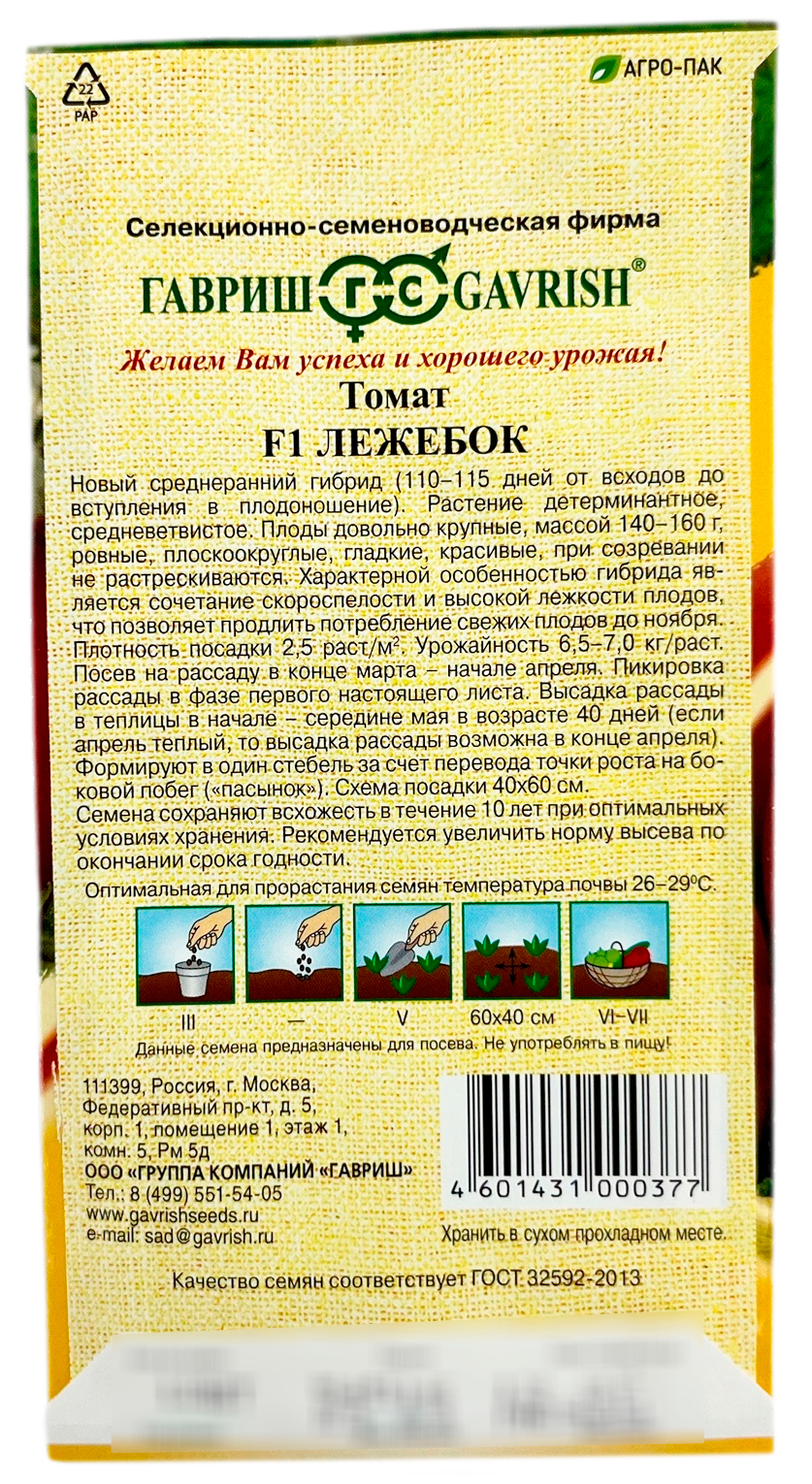 Томат Лежебок F1 ГАВРИШСреднеспелый (111-115 дней от всходов до плодоношения) среднерослый (1,3-1,5 м) гибрид, рекомендован для пленочных и остекленных теплиц. Посев на рассаду в конце марта – начале апреля. Пикировка рассады в фазе первого настоящего листа. Высадка рассады в теплицы в начале-середине мая в возрасте 40 дней (если апрель теплый, то высадка рассады возможна в конце апреля). Формируют в один стебель за счет перевода точки роста на боковой побег («пасынок»). Плоды плоскоокруглой формы, массой 140-160 г. Прекрасно подходит для приготовления свежих салатов и цельноплодного консервирования. Гибрид отличается высокой лежкостью плодов. Схема посадки 40х60 см. Гибрид устойчив к возбудителям вируса табачной мозаики, кладоспориоза, фузариоза. Урожайность одного растения 6,5-7,0 кг.