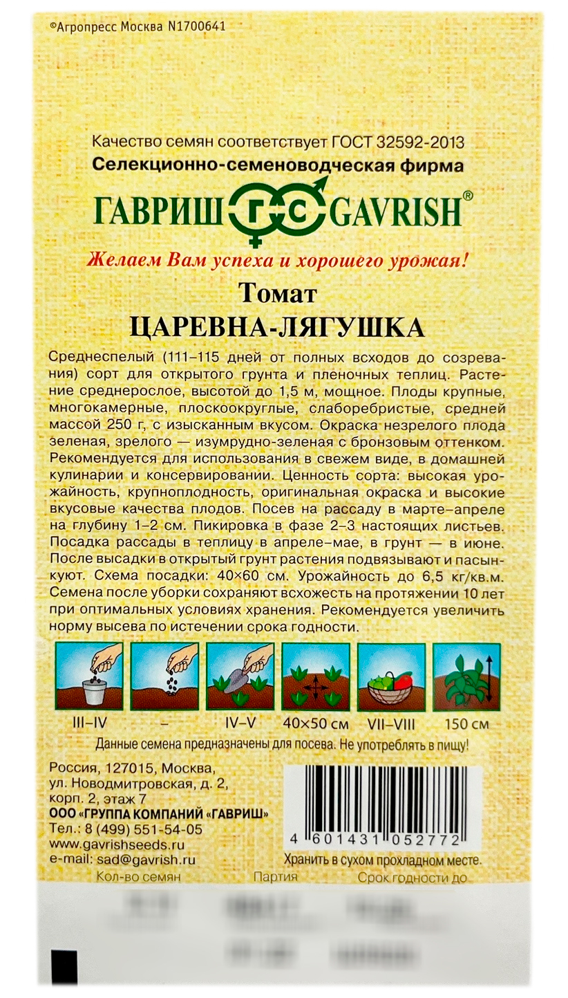 Томат царевна-лягушка ГАВРИШСреднеранний (111-115 дней от полных всходов до созревания) сорт для открытого грунта и пленочных теплиц. Растение среднерослое, высотой до 1,5 м, мощное. Плоды крупные, многокамерные, плоскоокруглые, слаборебристые, средней массой 250 г, с изысканным вкусом. Окраска незрелого плода зеленая, зрелого - изумрудно-зеленая с бронзовым оттенком. Рекомендуется для использования в свежем виде, в домашней кулинарии и консервировании. Ценность сорта: высокая урожайность, крупноплодность, оригинальная окраска и высокие вкусовые качества плодов. Посев на рассаду в марте-апреле на глубину 1-2 см. Пикировка в фазе 2-3 настоящих листьев. Посадка рассады в теплицу в апреле-мае, в грунт - в июне. После высадки в открытый грунт растения подвязывают и пасынкуют. Схема посадки: 40x60 см. Урожайность до 6,5 кг/кв.м.