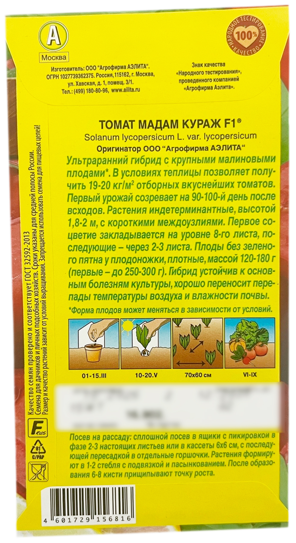 Томат МАДАМ КУРАЖ F1 АЭЛИТАКрупноплодный, высокоурожайный гибрид очень раннего срока созревания. Позволяет получать 19-20 кг/м2. Первые томаты снимают на 90-100 день после всходов. Растения индетерминантные, средней высоты, с короткими междоузлиями. Первое соцветие закладывается над 6-7 листом, последующие – через 3 листа. Плоды без зеленого пятна у плодоножки, плотные, массой 120-180 г, очень вкусные и ароматные. Гибрид устойчив к основным болезням культуры, хорошо переносит перепады температуры воздуха и влажности почвы.