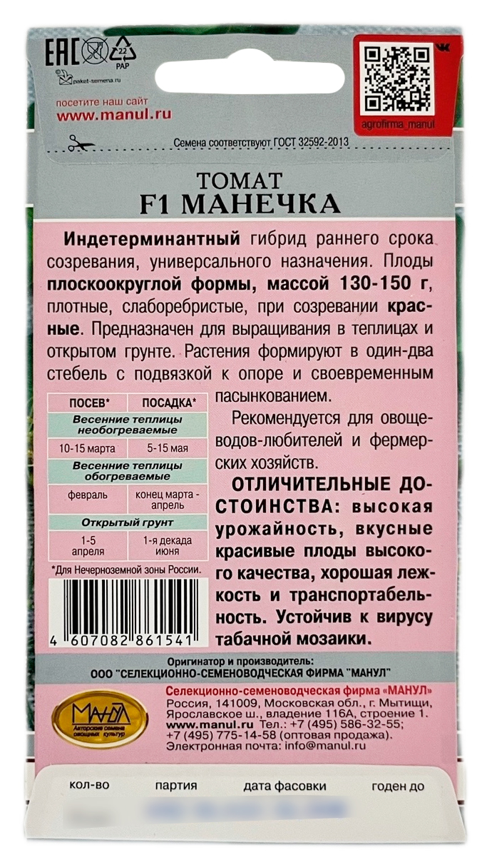 Томат МАНЕЧКА МАНУЛИндетерминантный гибрид раннего срока созревания, универсального назначения. Плоды плоскоокруглой формы, массой 130-150 г, плотные, слаборебристые, при созревании красные. Предназначен для выращивания в теплицах и открытом грунте. Растения формируют в один-два стебель с подвязкой к опоре и своевременным пасынкованием.
