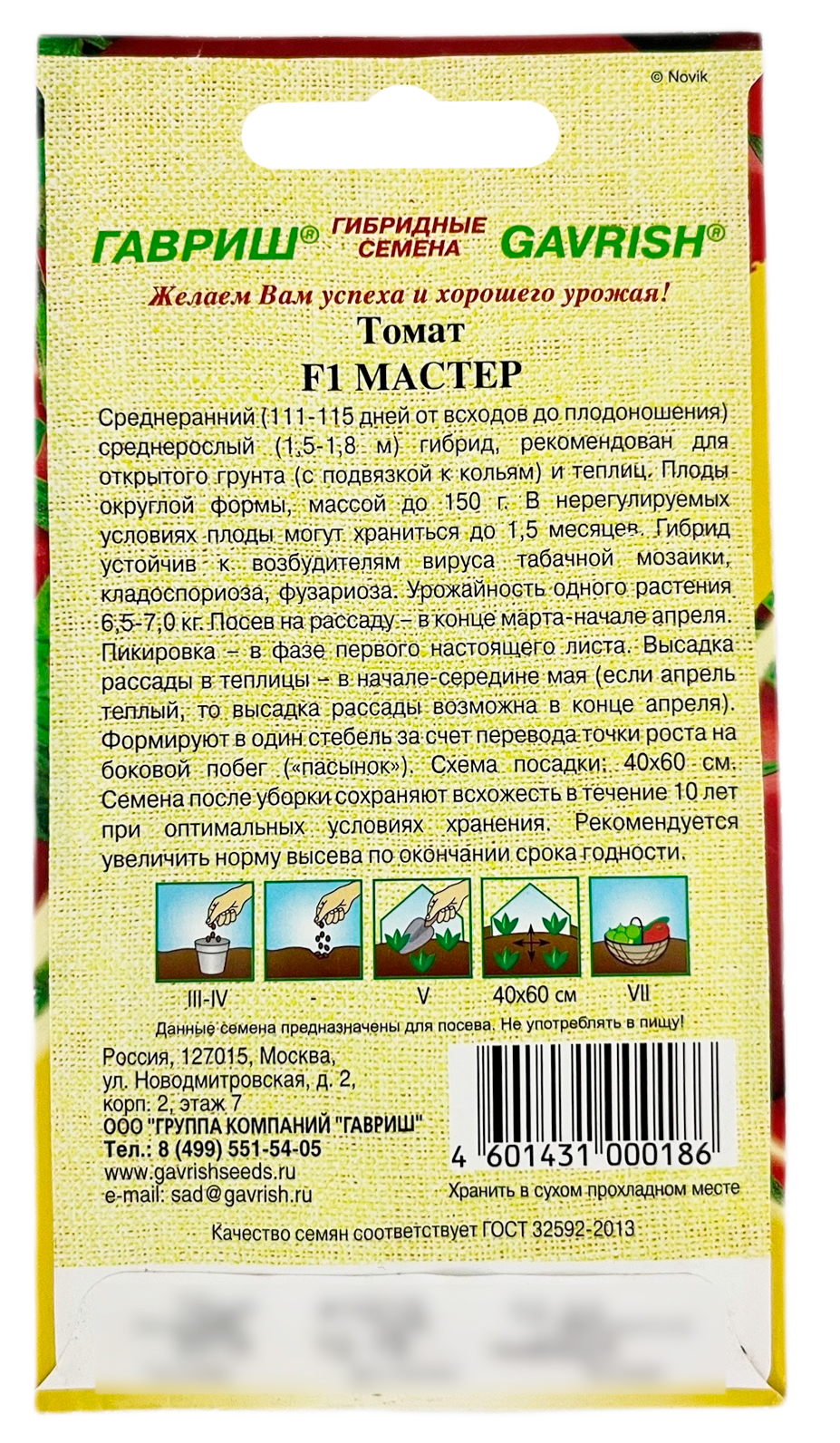 Томат Мастер F1 ГАВРИШСреднеспелый (111-115 дней от всходов до плодоношения) высокорослый (1,5-1,8 м) гибрид, рекомендован для пленочных и остекленных теплиц. Посев на рассаду в конце марта – начале апреля. Пикировка в фазе первого настоящего листа. Высадка рассады в теплицы в начале-середине мая в возрасте 40 дней (если апрель теплый, то высадка рассады возможна в конце апреля). Формируют в один стебель за счет перевода точки роста на боковой побег («пасынок»). Плоды округлой формы, массой до 150 г. В нерегулируемых условиях плоды могут храниться до 1,5 месяцев. Схема посадки 40х60 см. Гибрид устойчив к возбудителям вируса табачной мозаики, кладоспориоза, фузариоза. Урожайность одного растения 6,5-7,0 кг.