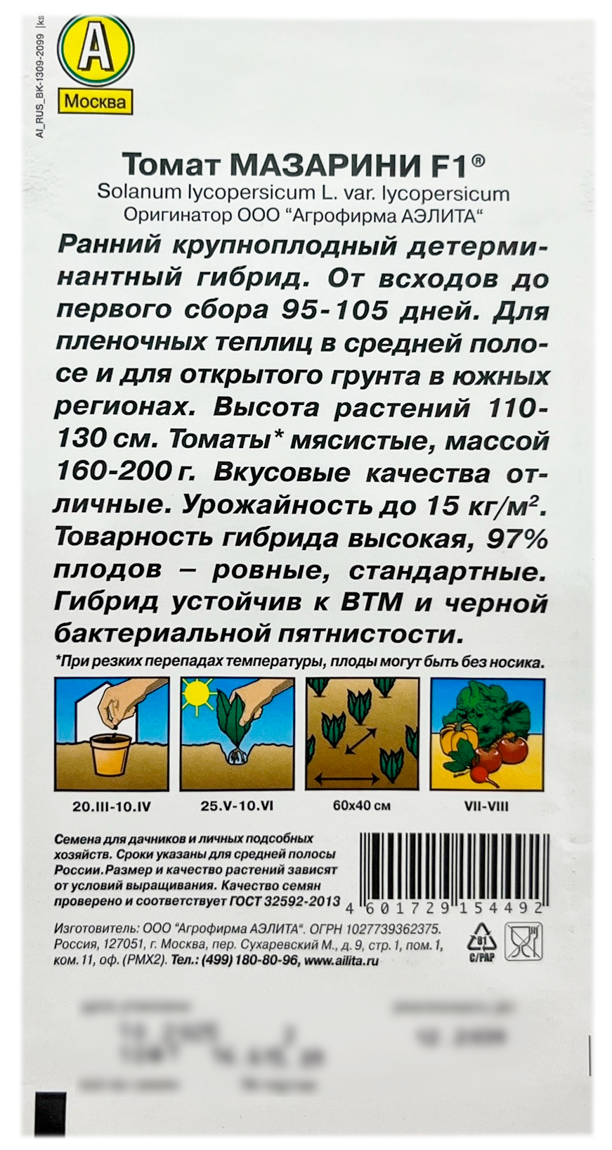 Томат МАЗАРИНИ F1 АЭЛИТАРанний крупноплодный детерминантный гибрид. От всходов до первого сбора 95-105 дней. Для пленочных теплиц в средней полосе и для открытого грунта в южных регионах. Высота растений 110-130 см. Томаты* мясистые, массой 160-200 г. Вкусовые качества отличные. Товарность гибрида высокая, 97% плодов –ровные, стандартные. Гибрид устойчив к ВТМ и черной бактериальной пятнистости.