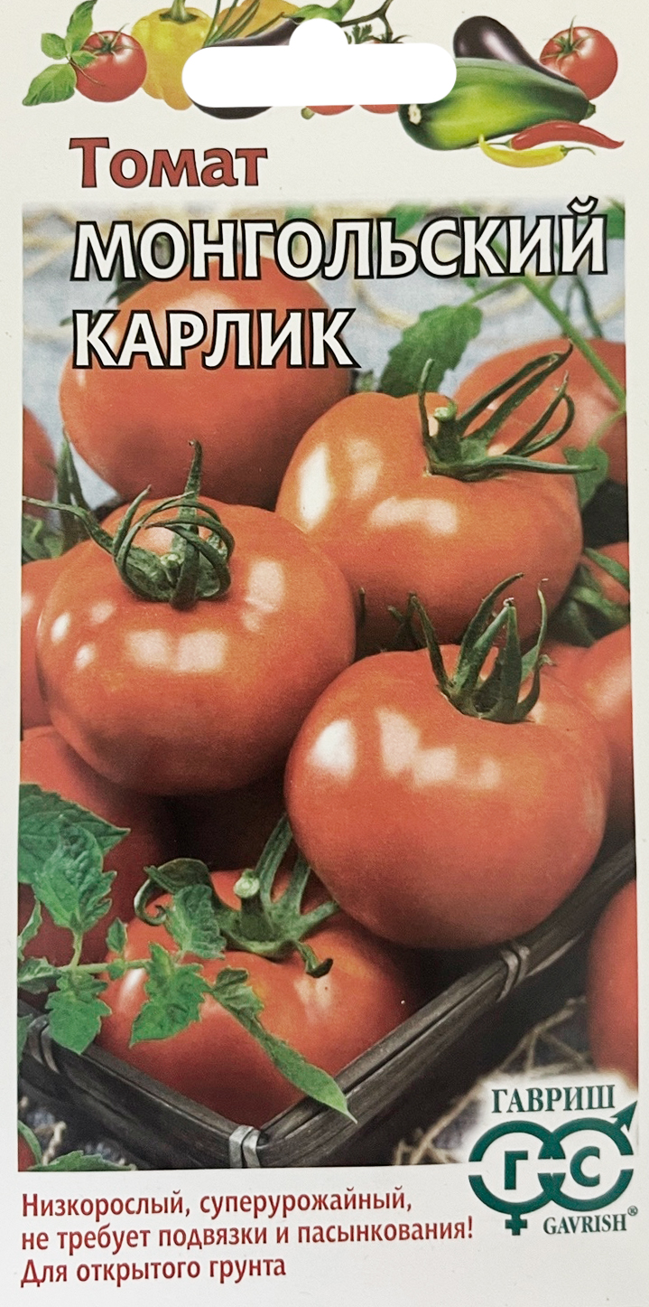 Томат Монгольский карликСуперурожайный, супернизкорослый (высотой всего 30 см), стелющийся сорт для открытого грунта. Томат Монгольский карлик не нуждается в подвязке и пасынковании, но разрастаясь, занимает большую площадь (примерно до 1 м). Благодаря раннему сроку созревания не поражается фитофторой. Плоды округлые, красного цвета, крупные, массой 100–150 г, что не характерно для низкорослых томатов. Вкус приятный томатный. Плоды подойдут для свежих салатов и консервирования. Сорт рекомендуется для выращивания в условиях короткого холодного лета Сибири, Урала, в условиях «рискованного» земледелия. Посев на рассаду производят в конце марта–начале апреля. Пикируют на стадии двух настоящих листочков. В открытый грунт высаживают рассаду в возрасте 55–60 дней. Семена сохраняют всхожесть в течение 10 лет при оптимальных условиях хранения. Рекомендуется увеличить норму высева по истечении срока годности.