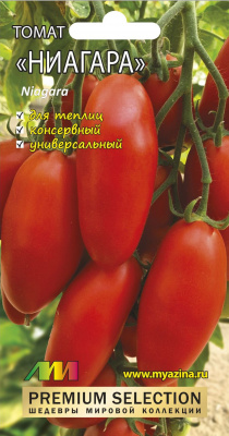 "Ниагара"(Niagara) Сорт индетерминантный, среднеранний, очень урожайный, для теплиц и открытого грунта на юге. Требует подвязки и пасынкования, вести в 1-2 стебля, второй пасынок пустить из-под первой кисти. Плод красный, удлинённый, см 10-12, массой около 100г, две камеры, стенки плода плотные, мясистые, ароматный, приятного вкуса, для свежего потребления, консервирования, особенно, благодаря форме и консистенции, для сушки, заморозки, вялить - для любых заготовок на зиму,Характеристики