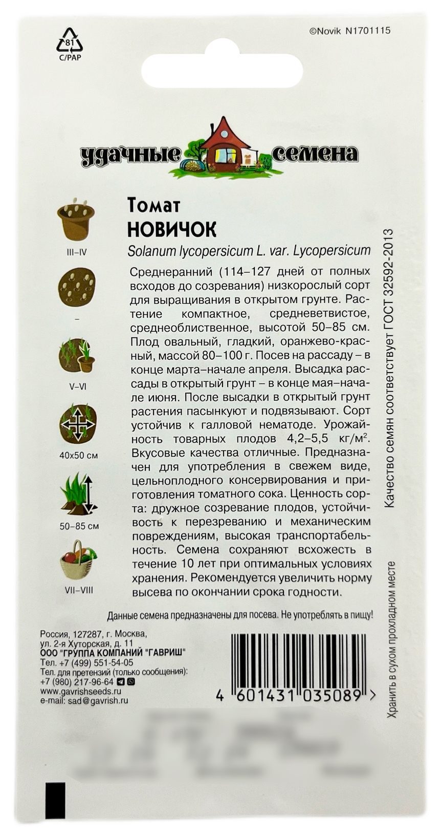 Томат Новичок Уд. с. Семян больше (Solanum lycopersicum L. var. lycopersicum)Среднеранний (114–120 дней от полных всходов до созревания) низкорослый сорт для выращивания в открытом грунте. Растение компактное, средневетвистое, среднеоблиственное, высотой 50–80 см. Плод овальный, гладкий, оранжево-красный, массой 80–100 г. Посев на рассаду: в конце марта – начале апреля. Высадка рассады в открытый грунт: в конце мая – начале июня. После высадки в открытый грунт растения пасынкуют и подвязывают. Сорт устойчив к галловой нематоде. Урожайность товарных плодов 4,2–5,5 кг/м2. Вкусовые качества отличные. Предназначен для употребления в свежем виде, цельноплодного консервирования и приготовления томатного сока. Ценность сорта: дружное созревание плодов, устойчивость к перезреванию и механическим повреждениям, высокая транспортабельность.