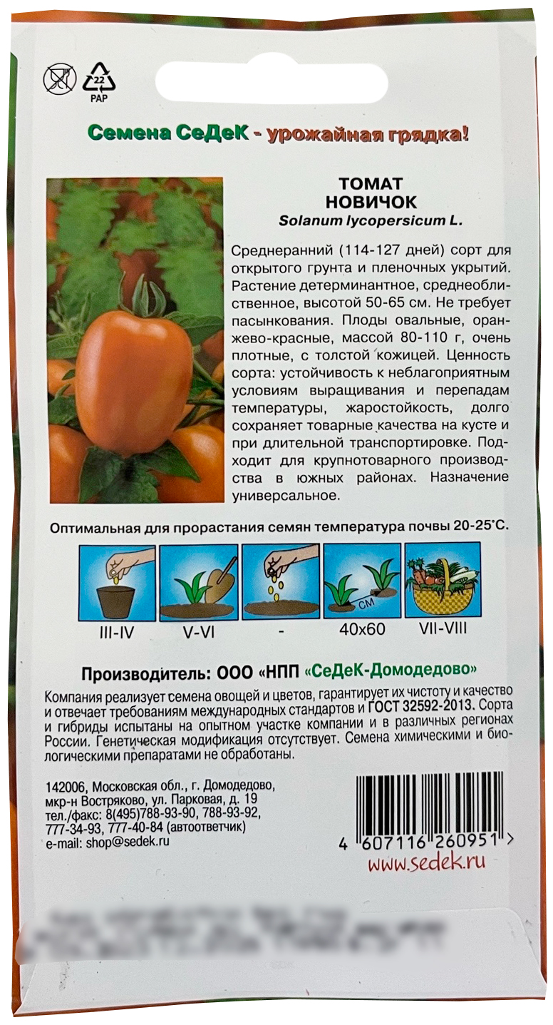 Томат Новичок СеДеКСреднеранний (114-127 дней) сорт для открытого грунта и пленочных укрытий. Растение детерминантное, среднеоблиственное, высотой 50-65 см. Не требует пасынкования. Плоды овальные, оранжево-красные, массой 80-110 г, очень плотные, с толстой кожицей. Ценность сорта: устойчивость к неблагоприятным условиям выращивания и перепадам температуры, жаростойкость, долго сохраняет товарные качества на кусте и при длительной транспортировке. Подходит для крупнотоварного производства в южных районах. Назначение универсальное.