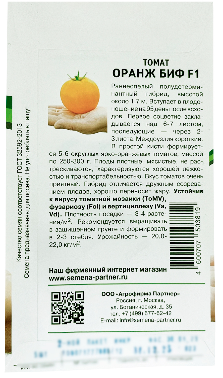 Томат Оранж Биф F1 ПАРТНЕРРаннеспелый полудетерминантный гибрид, высотой около 1,7 м. Вступает в плодоношение на 95 день после всходов. Первое соцветие закладывается над 6-7 листом, последующие — через 2-3 листа. Междоузлия короткие. В простой кисти формируется 5-6 округлых ярко-оранжевых томатов, массой по 250-300 г. Плоды плотные, мясистые, с приятным сбалансированным вкусом, не растрескиваются. Характеризуются хорошей лежкостью и транспортабельностью. Гибрид отличается дружным созреванием плодов, хорошо переносит жару. Устойчив к вирусу томатной мозаики (ToMV), фузариозному (Fol) и вертициллезному увяданию (Va, Vd). Плотность посадки — 3-4 растения/м². Рекомендуем выращивать в защищенном грунте и формировать в 2-3 стебля. Урожайность — 20,0-22,0 кг/м².