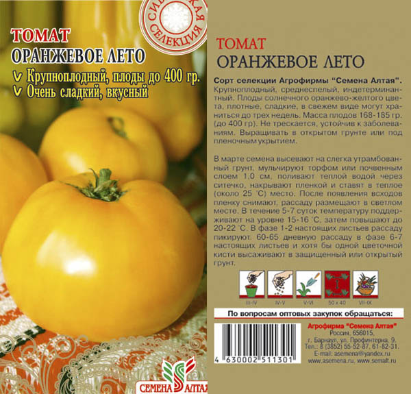 ТОМАТ ОРАНЖЕВОЕ ЛЕТОСорт селекции Агрофирмы "Семена Алтая".