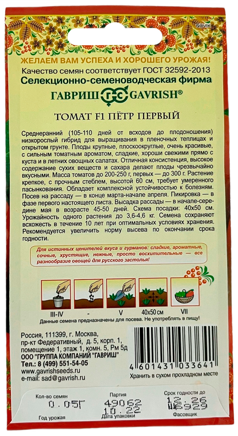 Томат Петр ПервыйСреднеранний (105-110 дней от всходов до плодоношения) низкорослый сорт для выращивания в пленочных теплицах и открытом грунте. Плоды с сильным томатным ароматом, сладкие, хороши под соусом и в летних овощных салатах. Отличная консистенция, высокое содержание сухих веществ делают плоды чрезвачайно вкусными. Посев на рассаду в конце марта &ndash, начале апреля. Пикировка в фазе первого настоящего листа. Высадка рассады в начале-середине мая в возрасте 45-50 дней (если апрель теплый, то высадка рассады возможна в конце апреля). Растение прочное, крепкое, высотой 60 см, требует умененного пасынкования. Плоды крупные, плоскоокруглые, очень красивые. Масса плодов до 200-250 г, первых - до 300 г. Схема посадки 40х50 см. Обладает комплексной устойчивостью к болезням. Урожайность одного растения до 3,6-4,6 кг.