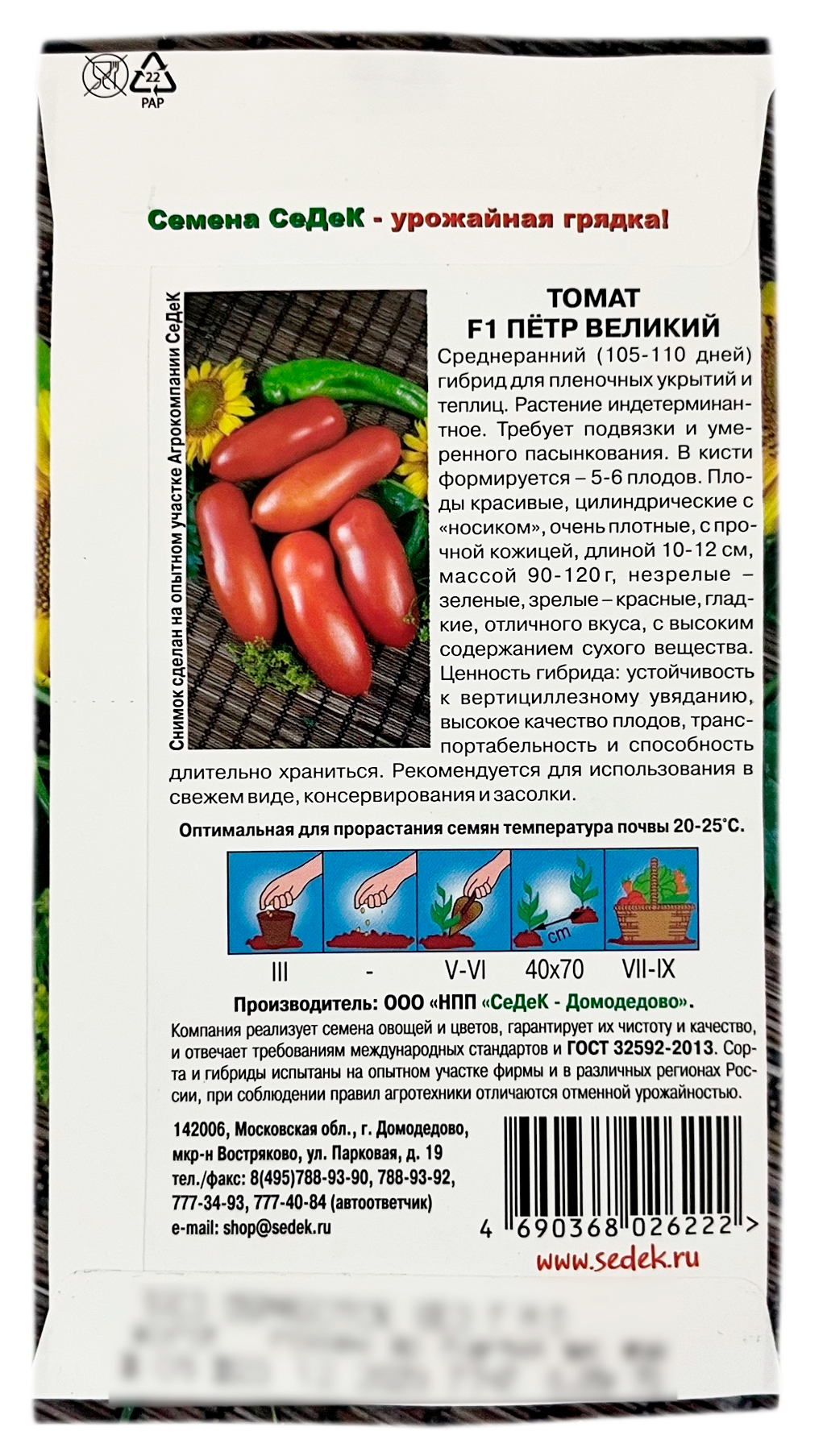Томат F1 ПЁТР ВЕЛИКИЙ СеДеКСреднеранний (105-110 дней) гибрид для пленочных укрытий и теплиц. Растение индетерминантное. Требует подвязки и умеренного пасынкования. В кисти формируется – 5-6 плодов. Плоды красивые, цилиндрические c «носиком», очень плотные, с прочной кожицей, длиной 10-12 см, массой 90-120 г, незрелые - зеленые, зрелые - красные, гладкие, отличного вкуса, с высоким содержанием сухого вещества. Ценность гибрида: устойчивость к вертициллезному увяданию, высокое качество плодов, транспортабельность и способность длительно храниться. Рекомендуется для использования в свежем виде, консервирования и засолки.