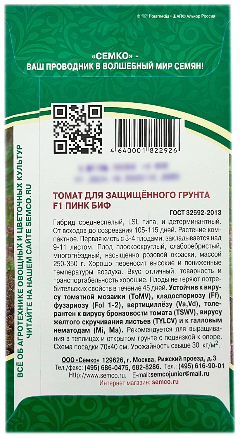 Томат для защищённого грунта F1 ПИНК БИФ СЕМКОГибрид среднеспелый, индетерминантныйLSL типа. От всходов до созревания 105-115 дней. Растение компактное. Первая кисть с 3-4 плодами, закладывается над 9-11 листом. Плод плоскоокруглый, слаборебристый, многогнёздный, насыщенно розовой окраски, без зелёного пятна у плодоножки, массой 250-350 г. Хорошо переносит высокие и пониженные температуры воздуха. Вкус отличный, товарность и транспортабельность хорошие. Плоды не теряют потребительских свойства в течение 45 дней. Устойчив к вирусу томатной мозаики (TоMV), кладоспориозу (Ff), фузариозу (Fol 1-2), вертициллёзу (Va,Vd), толерантен к вирусу бронзовости томата (TSWV), вирусу желтого скручивания листьев (TYLCV) и к галловым нематодам (Mi, Mа). Используется для потребления в свежем виде. Рекомендуется для выращивания в теплицах и открытом грунте с подвязкой к опоре.