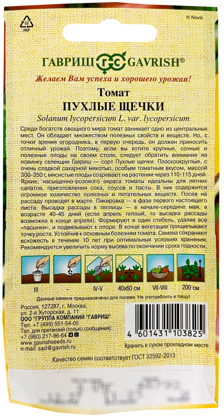 Томат Пухлые щечкиСреди богатства овощного мира томат занимает одно из центральных мест. Он обладает множеством полезных свойств и веществ. Но, с точки зрения огородника, в первую очередь, он должен приносить отличный урожай. Поэтому, если вы хотите крупные, сочные и полезные плоды на своем столе, следует обратить внимание на новинку селекции Гавриш — сорт Пухлые щечки. Плоскоокруглые, с очень сладкой, сахарной мякотью, особым томатным вкусом, массой 300-350 г, мясистые плоды созревают на растении через 110-115 дней. Яркие, насыщенно-розового окраса томаты идеальны для летних салатов, приготовления сока, соусов и пасты. В них содержится огромное количество полезных и питательных веществ. Посев на рассаду проводят в марте. Пикировка — в фазе первого настоящего листа. Высадка рассады в теплицы — в начале-середине мая в возрасте 40-45 дней (если апрель теплый, то высадка рассады возможна в конце апреля). Формируют в один стебель, удаляя все «пасынки» и подвязывают к опоре. В конце вегетации прищипывают точку роста. Устойчив к основным болезням томата. Семена после уборки сохраняют всхожесть в течение 10 лет при оптимальных условиях хранения. Рекомендуется увеличить норму высева по окончании срока годности.